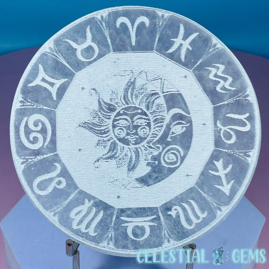Selenite (Satin Spar) Etched Zodiac Sun Moon Round Cleansing Plate 10cm