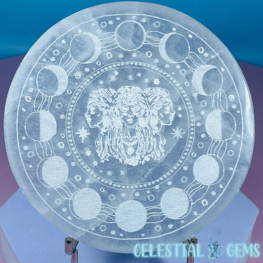 Selenite (Satin Spar) Etched 'Hecate' Moon Goddess Round Cleansing Plate 10cm