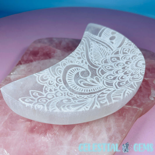 Selenite (Satin Spar) Mandala Etched Crescent Moon Bowl 12.5cm