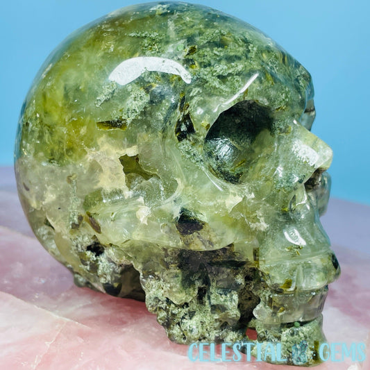 Kua hokona atuPrehnite + Epidote Skull Medium Carving