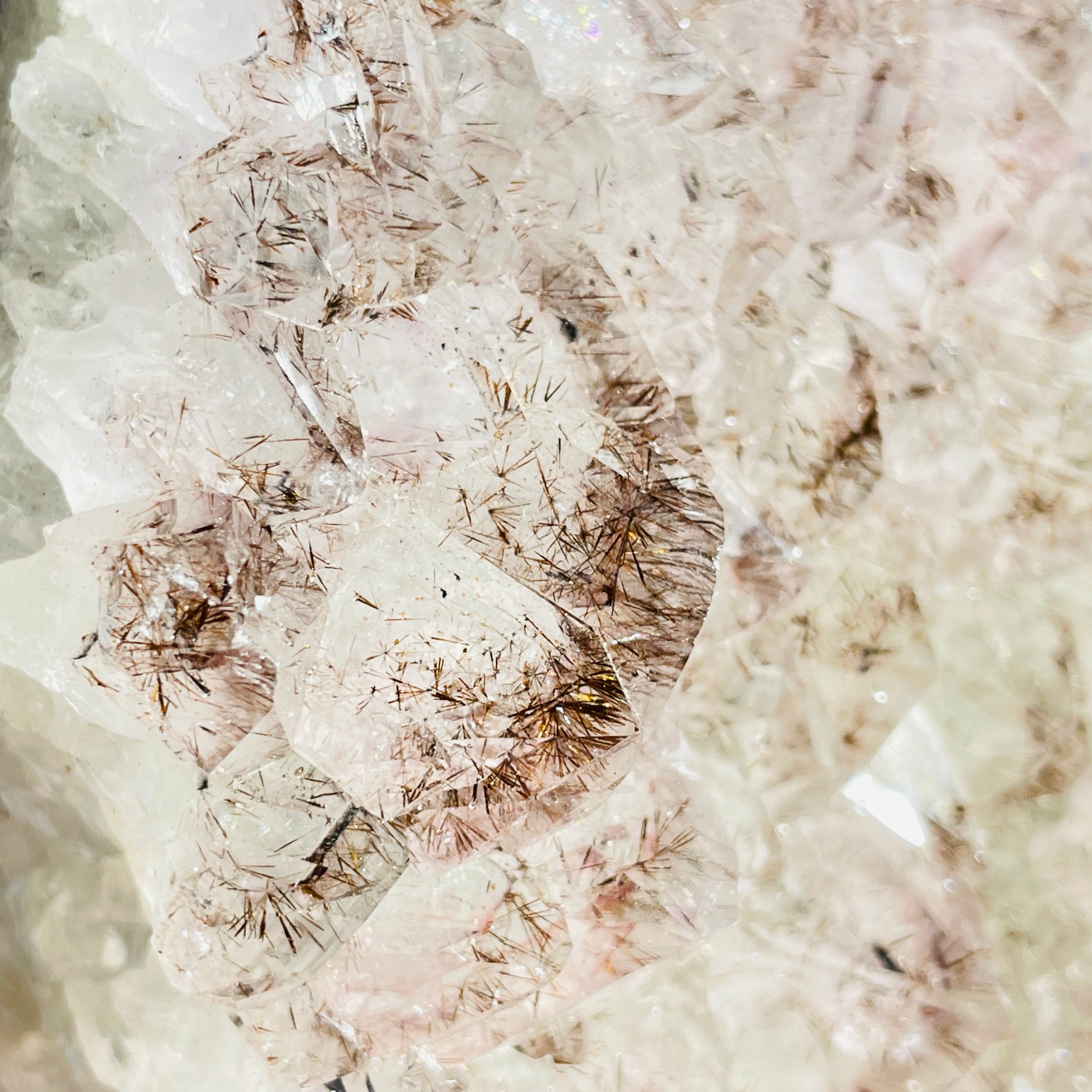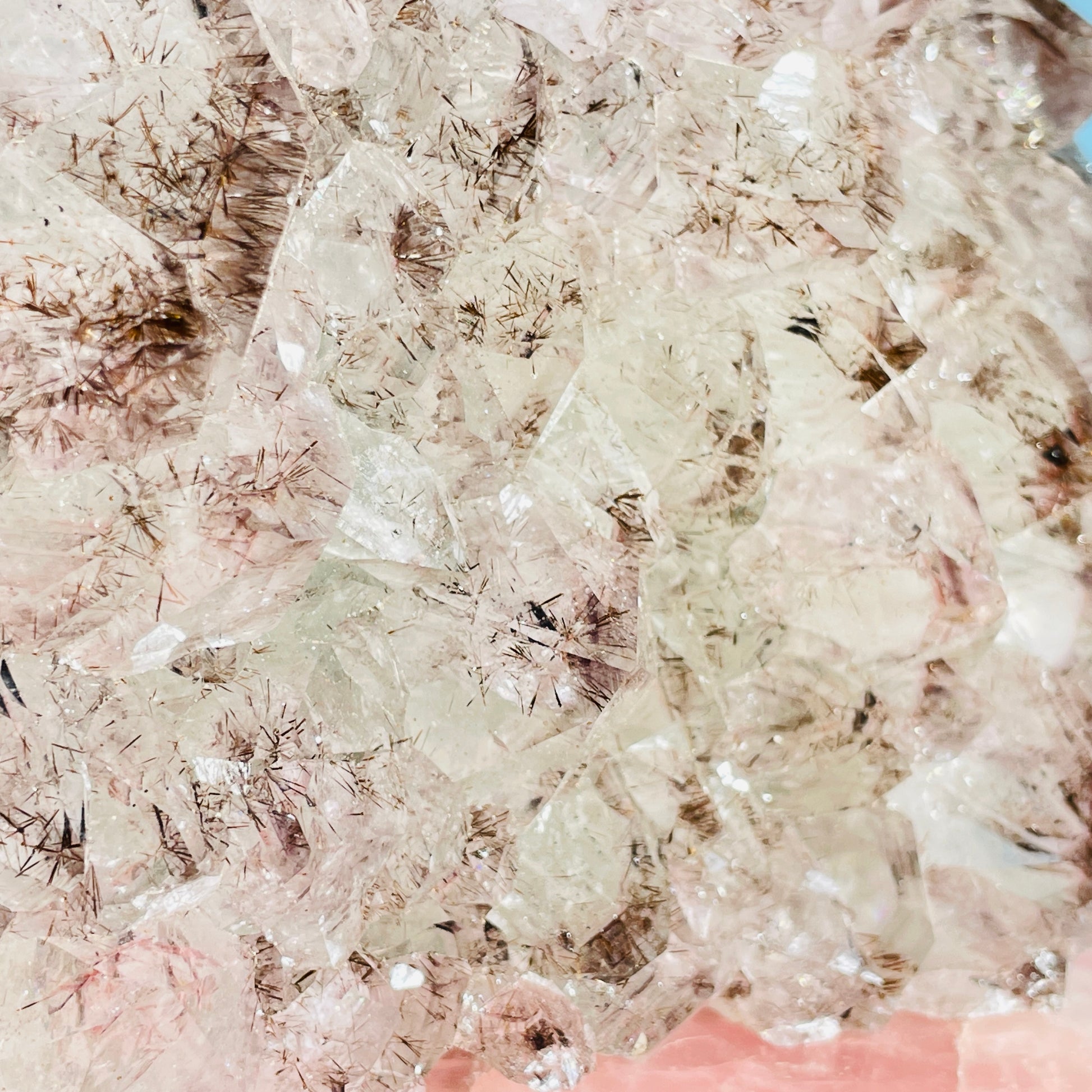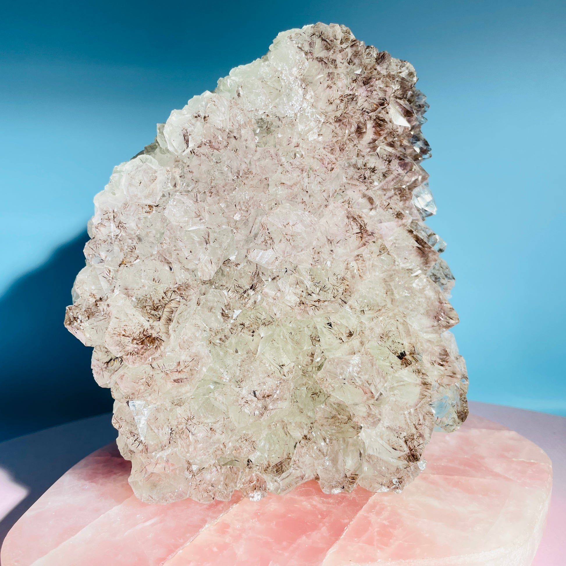 This piece has extremely glassy translucent crystals and a high concentration of reddish-brown Cacoxenite fibrous needle crystals within.