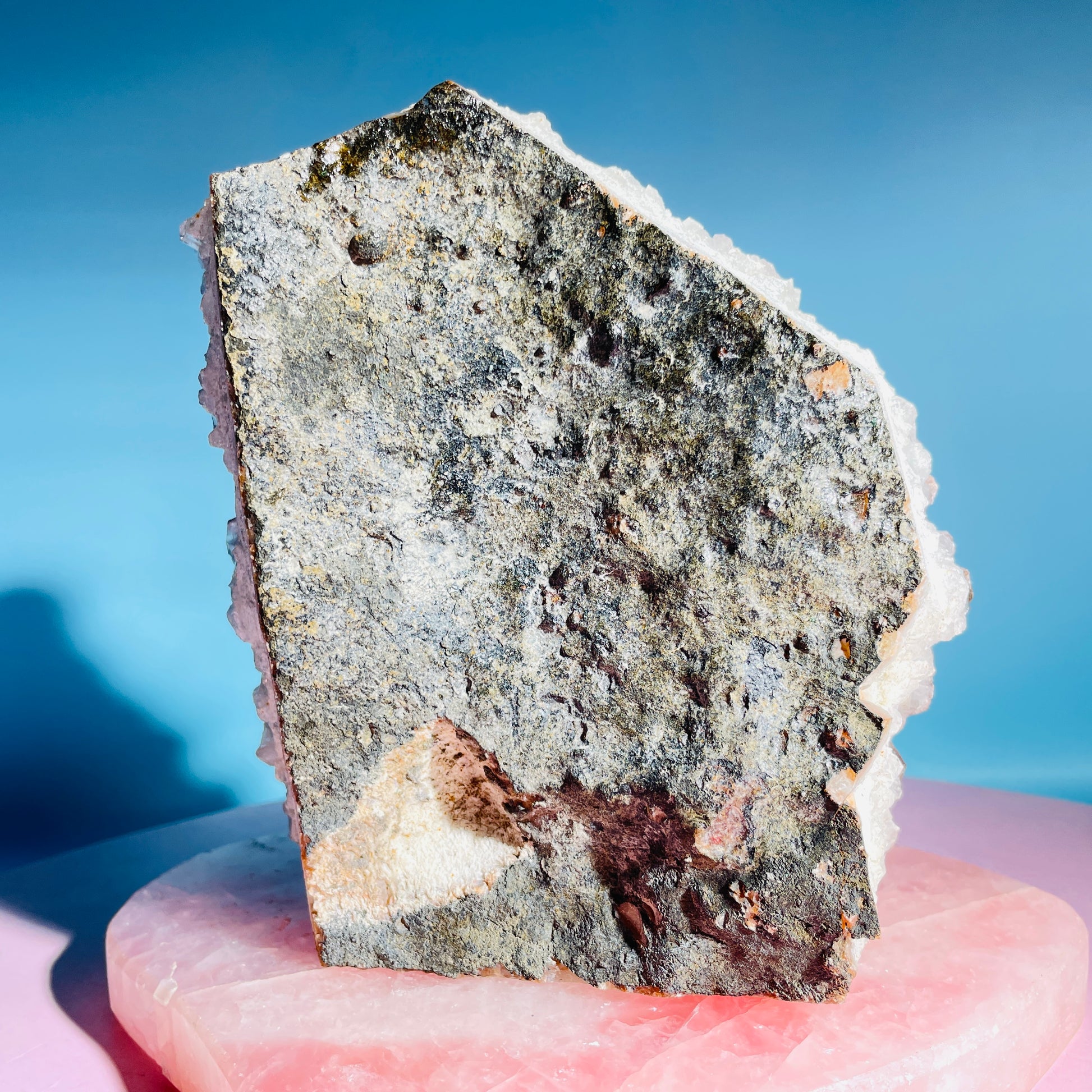 A sparkly cluster of Amethyst crystals with natural edges and a flat cut base for it to stand. With a rear of natural Agate, Celadonite and Basalt. Sourced from Brazil.