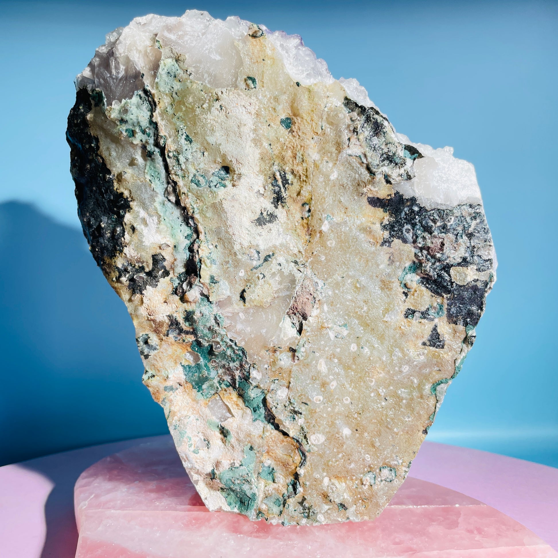 A sparkly cluster of Amethyst crystals with natural edges and a flat cut base for it to stand. With a rear of natural Agate, Celadonite and Basalt. Sourced from Brazil.