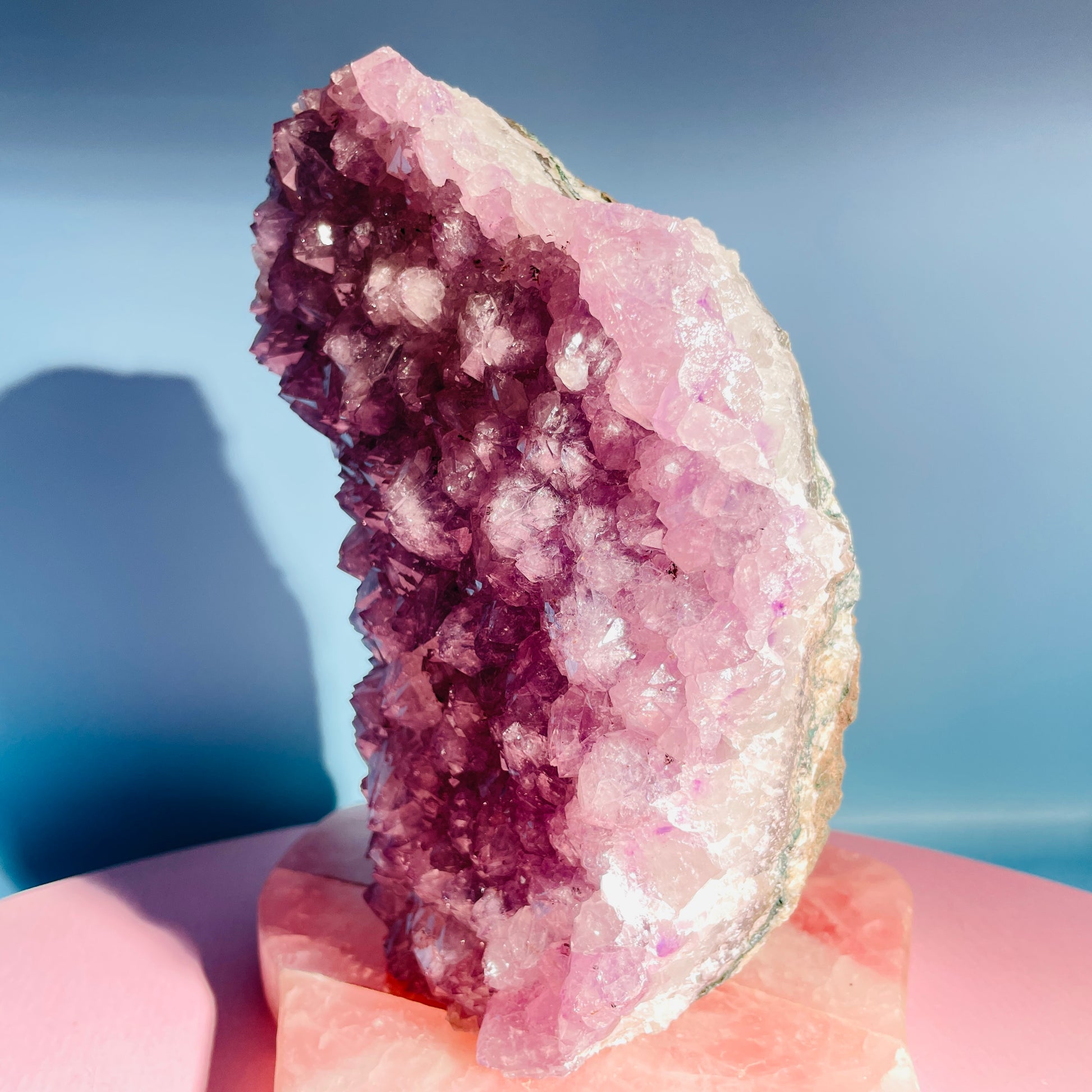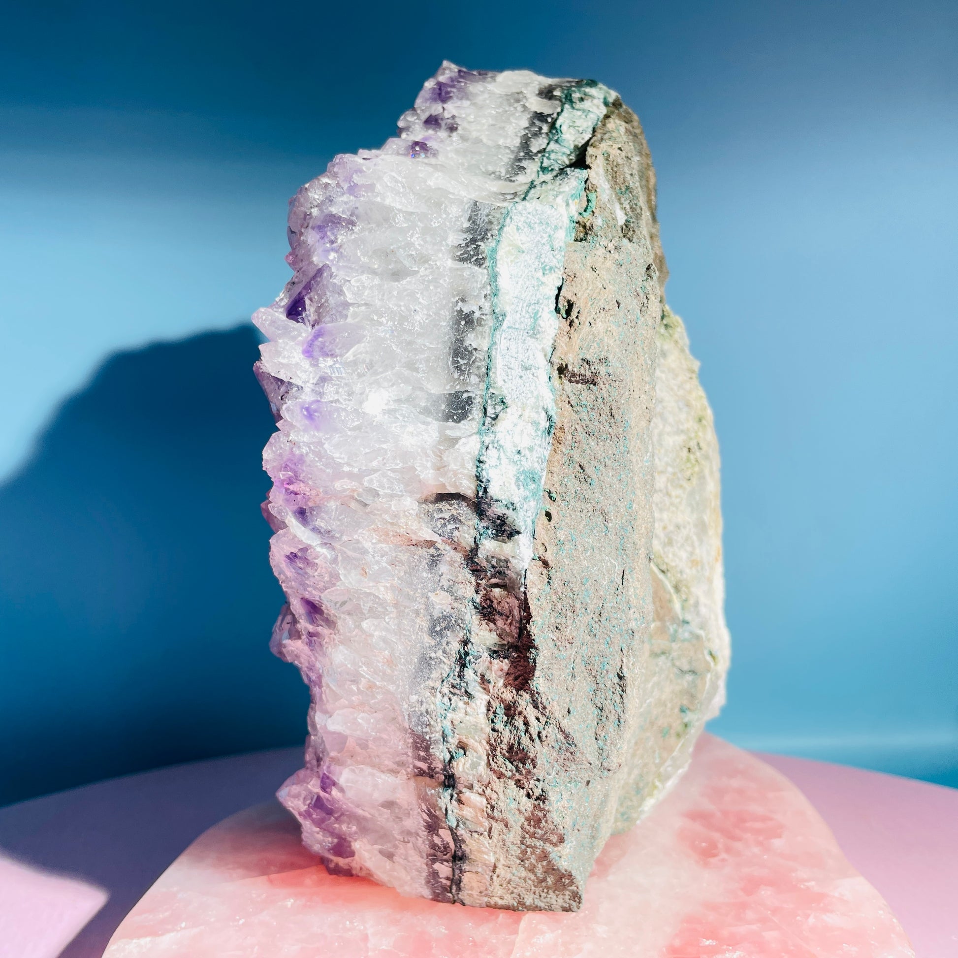This piece has layered Amethyst with unusual multi-terminated points growing over older layers of Amethyst (see side profile for layers).