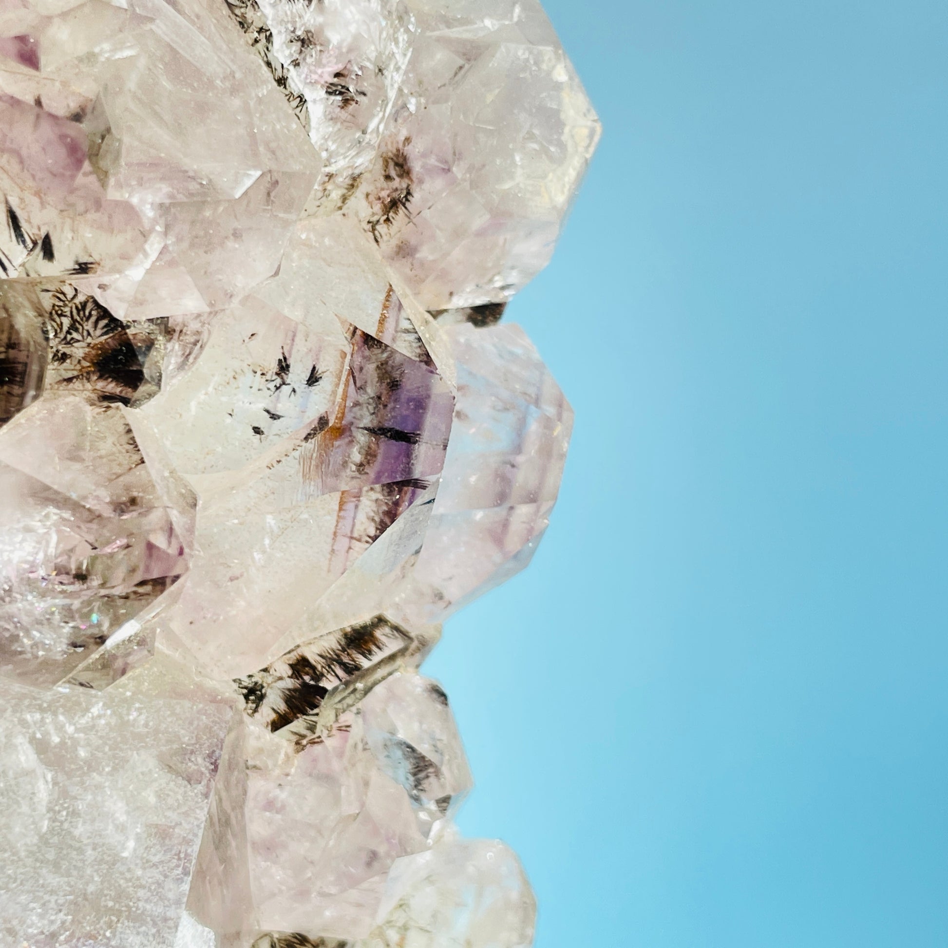 This piece has very glassy translucent Amethyst points with a high concentration of Cacoxenite fibrous needle crystals within.