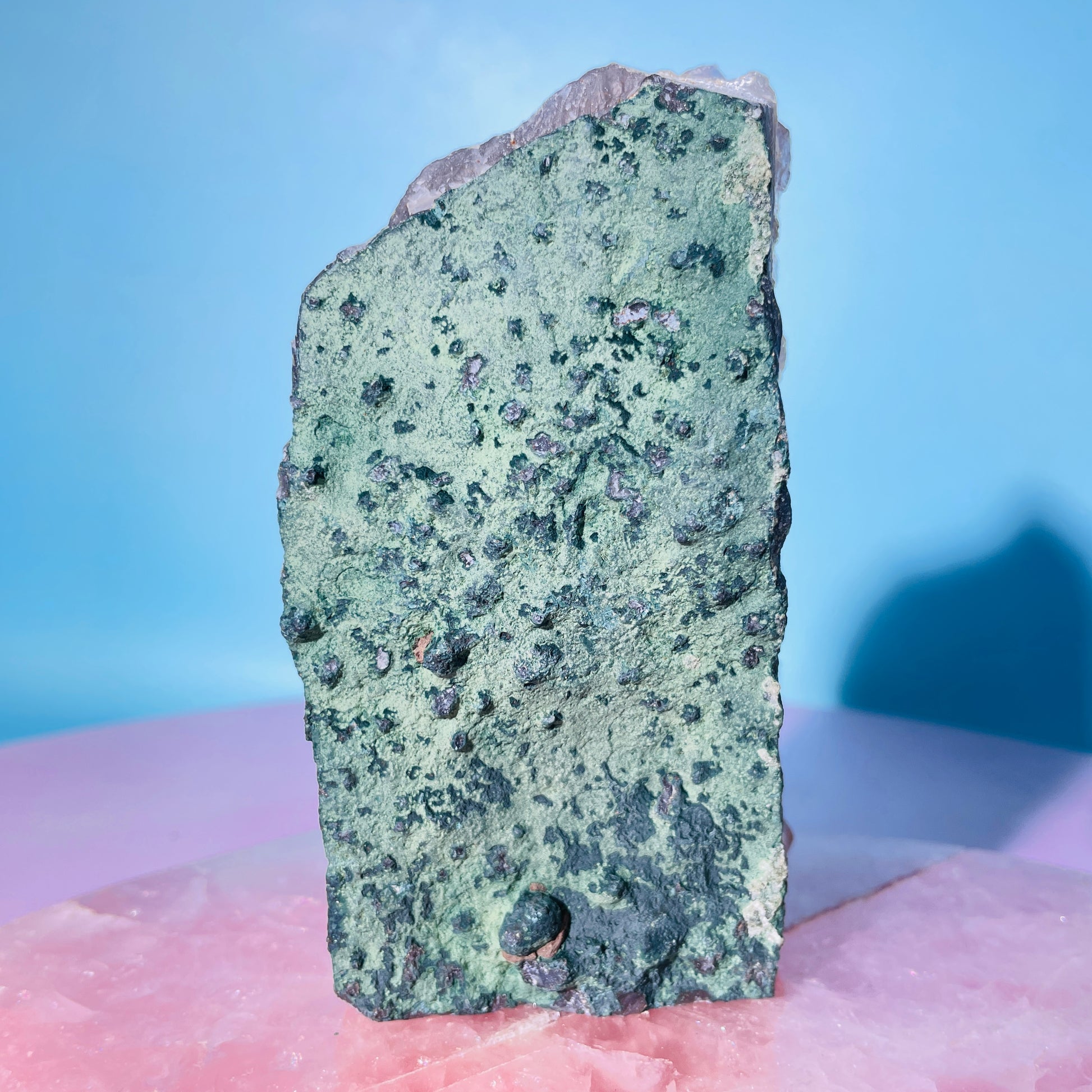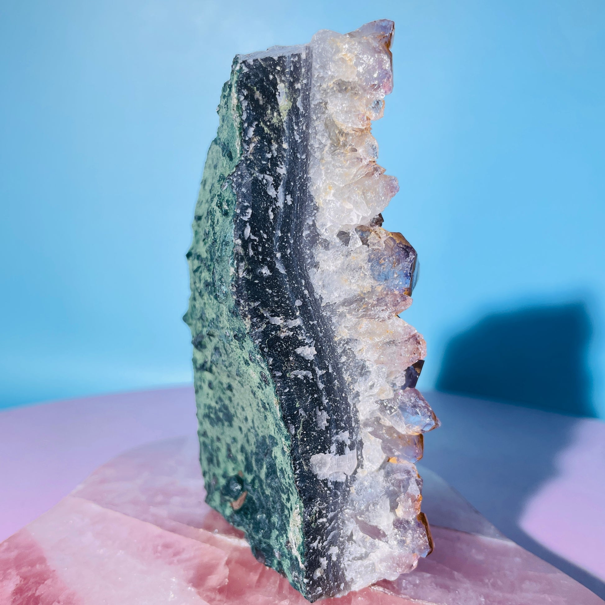 A sparkly cluster of Amethyst crystals with natural edges and a flat cut base for it to stand. With a rear of natural Agate, Celadonite and Basalt. Sourced from Brazil.