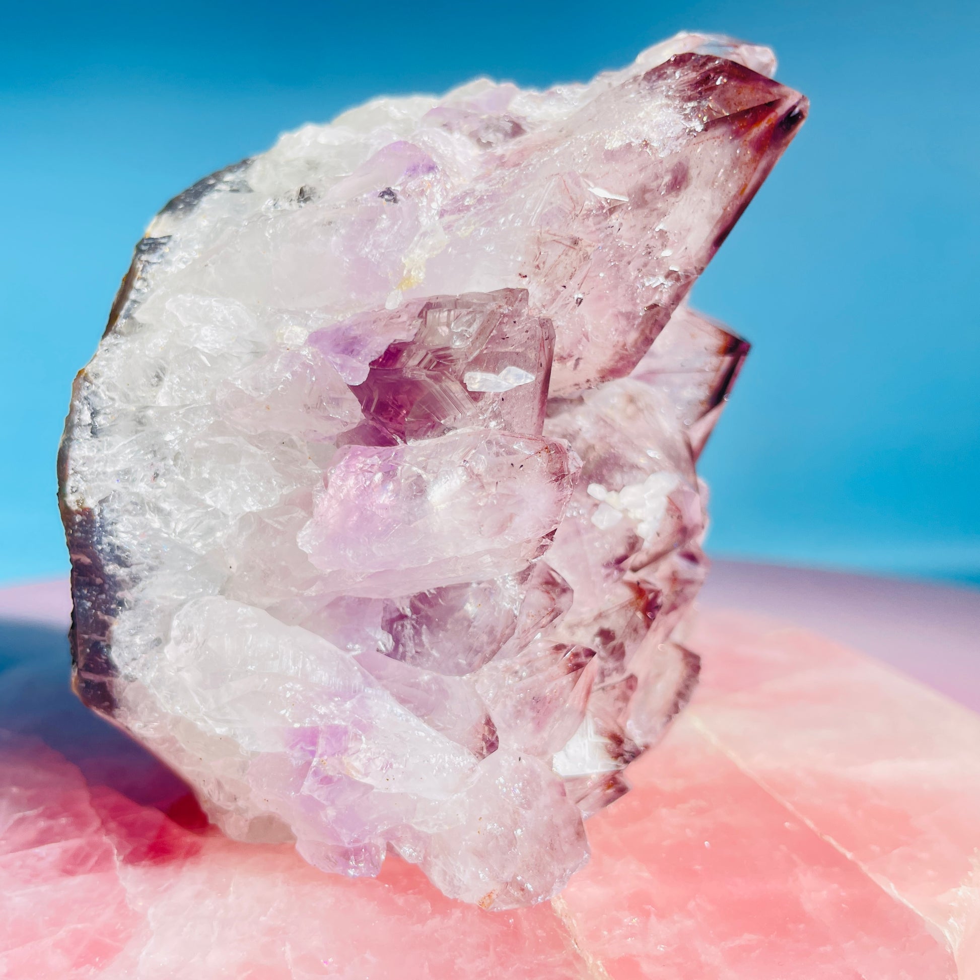 This piece has natural Calcite points growing on one of the Amethyst points and red Hematite phantom markings within.