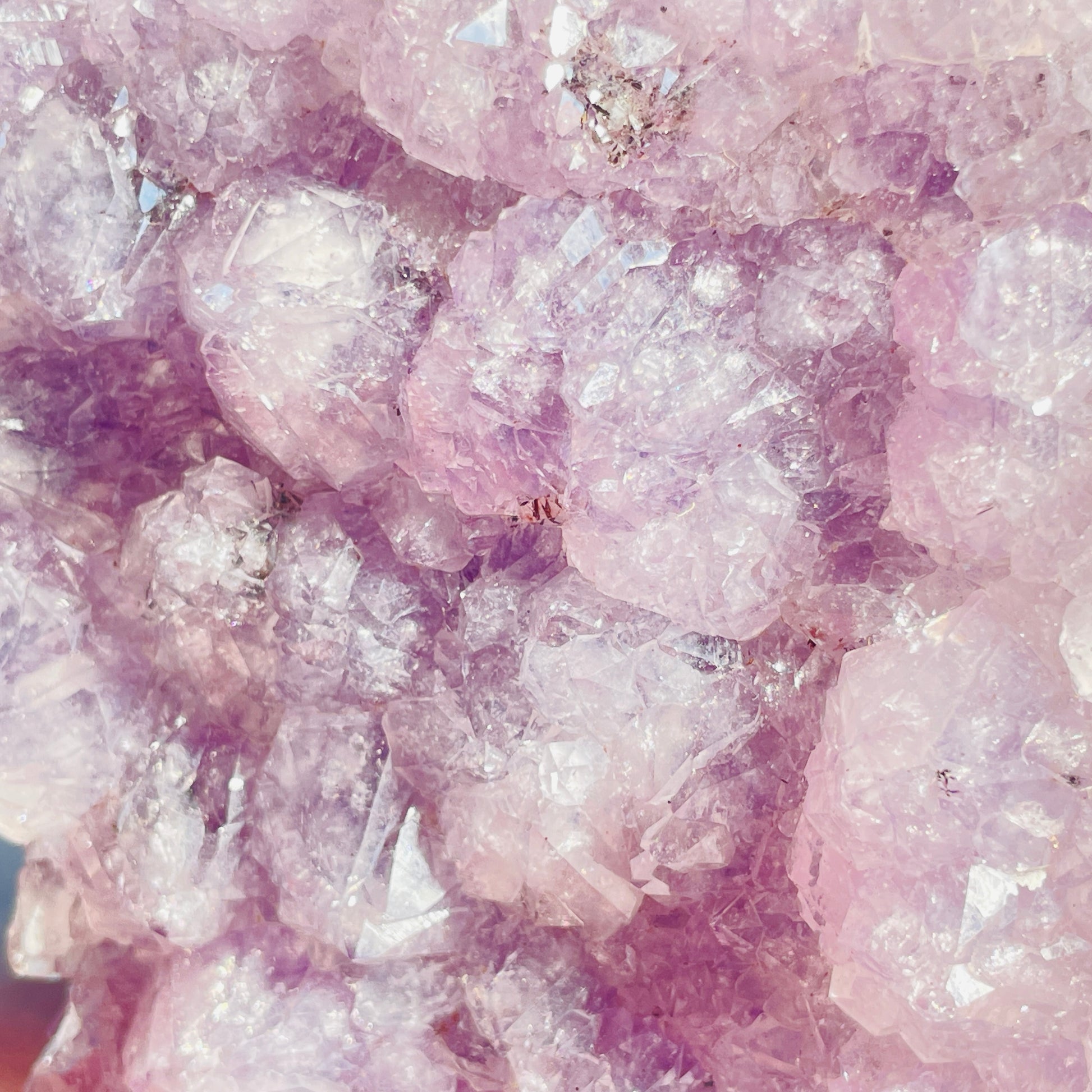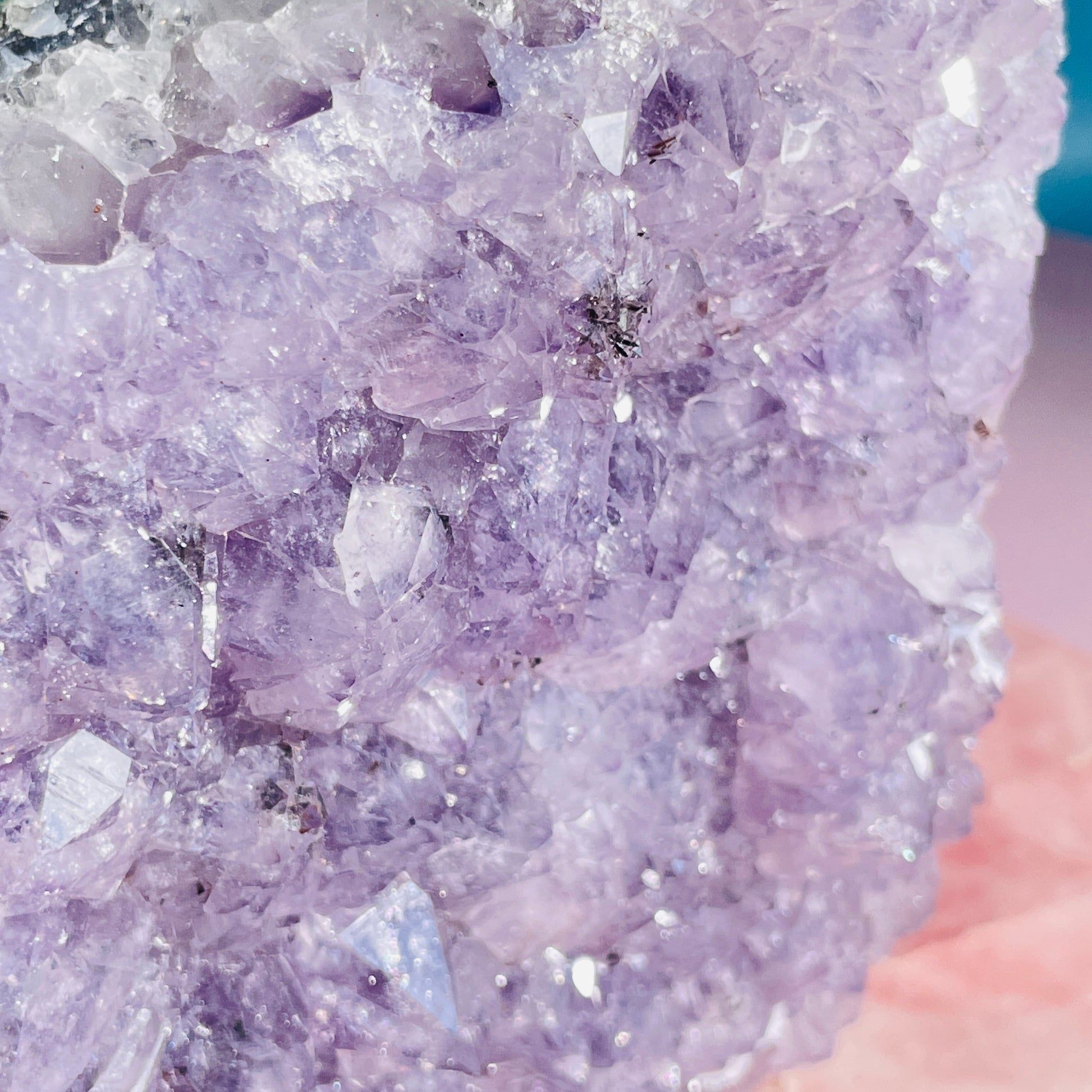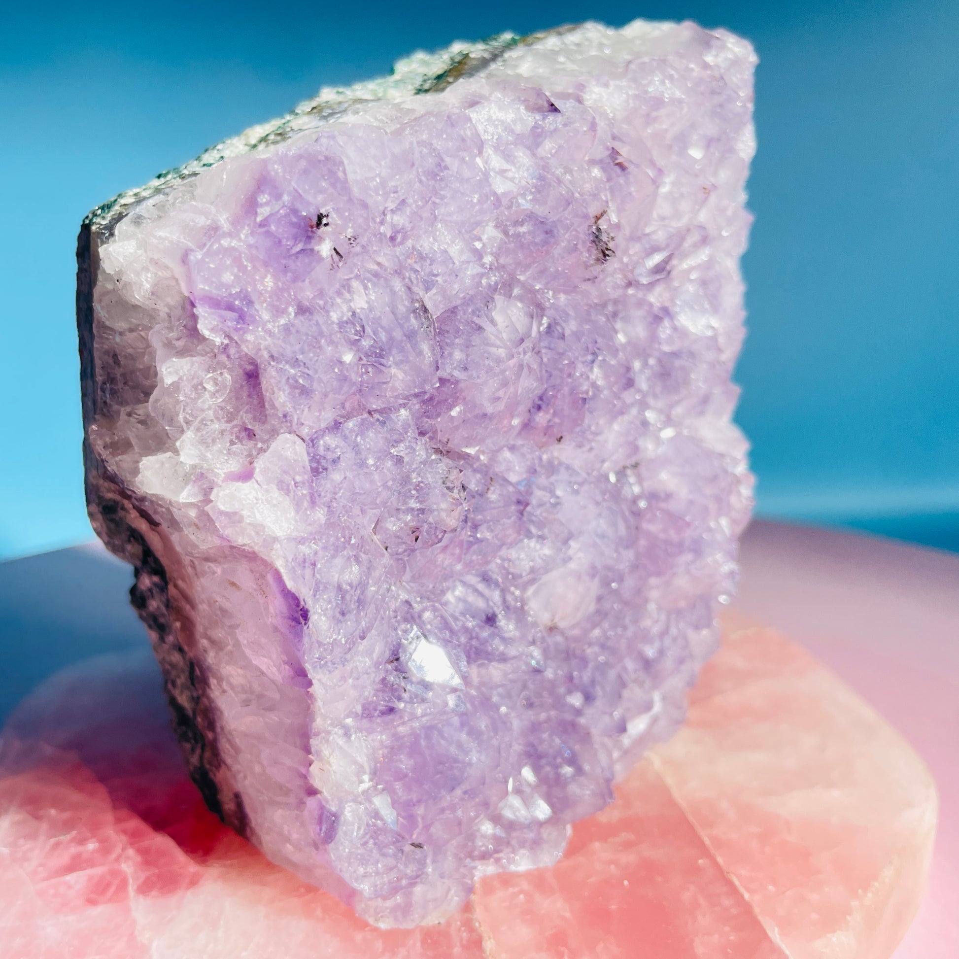 A sparkly cluster of Amethyst crystals with natural edges and a flat cut base for it to stand. With a rear of natural Agate, Celadonite and Basalt. Sourced from Brazil.