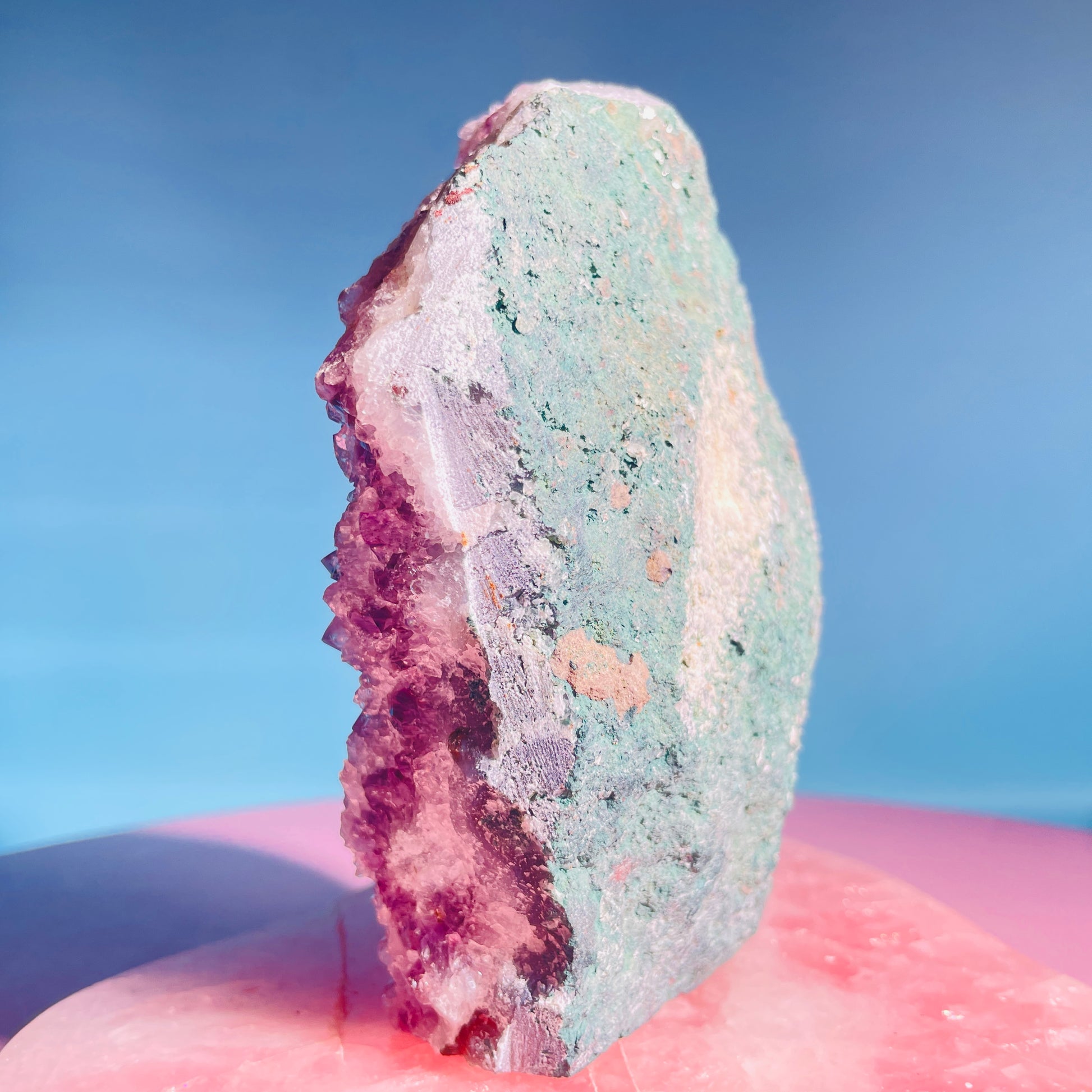 A sparkly cluster of Amethyst crystals with natural edges and a flat cut base for it to stand. With a rear of natural Agate, Celadonite and Basalt. Sourced from Brazil.