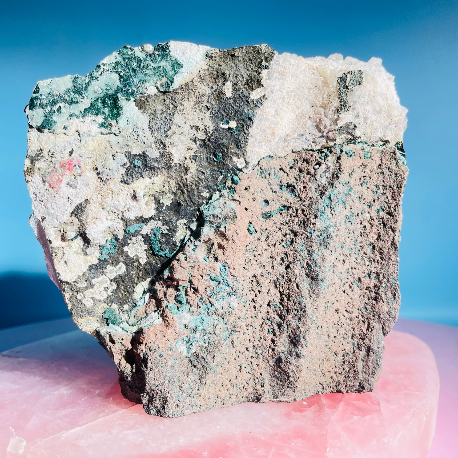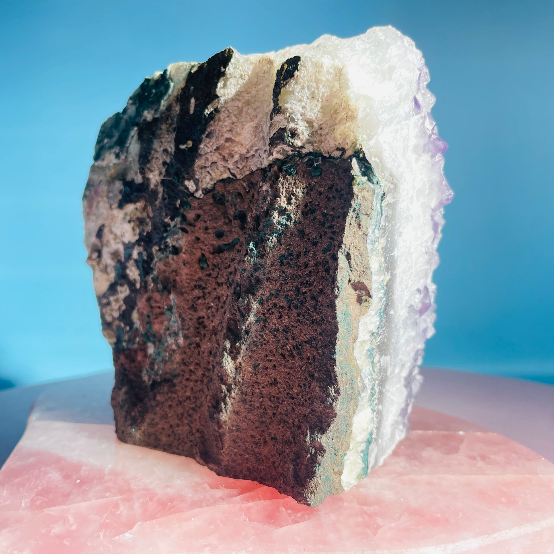 A sparkly cluster of Amethyst crystals with natural edges and a flat cut base for it to stand. With a rear of natural Agate, Celadonite and Basalt. Sourced from Brazil.