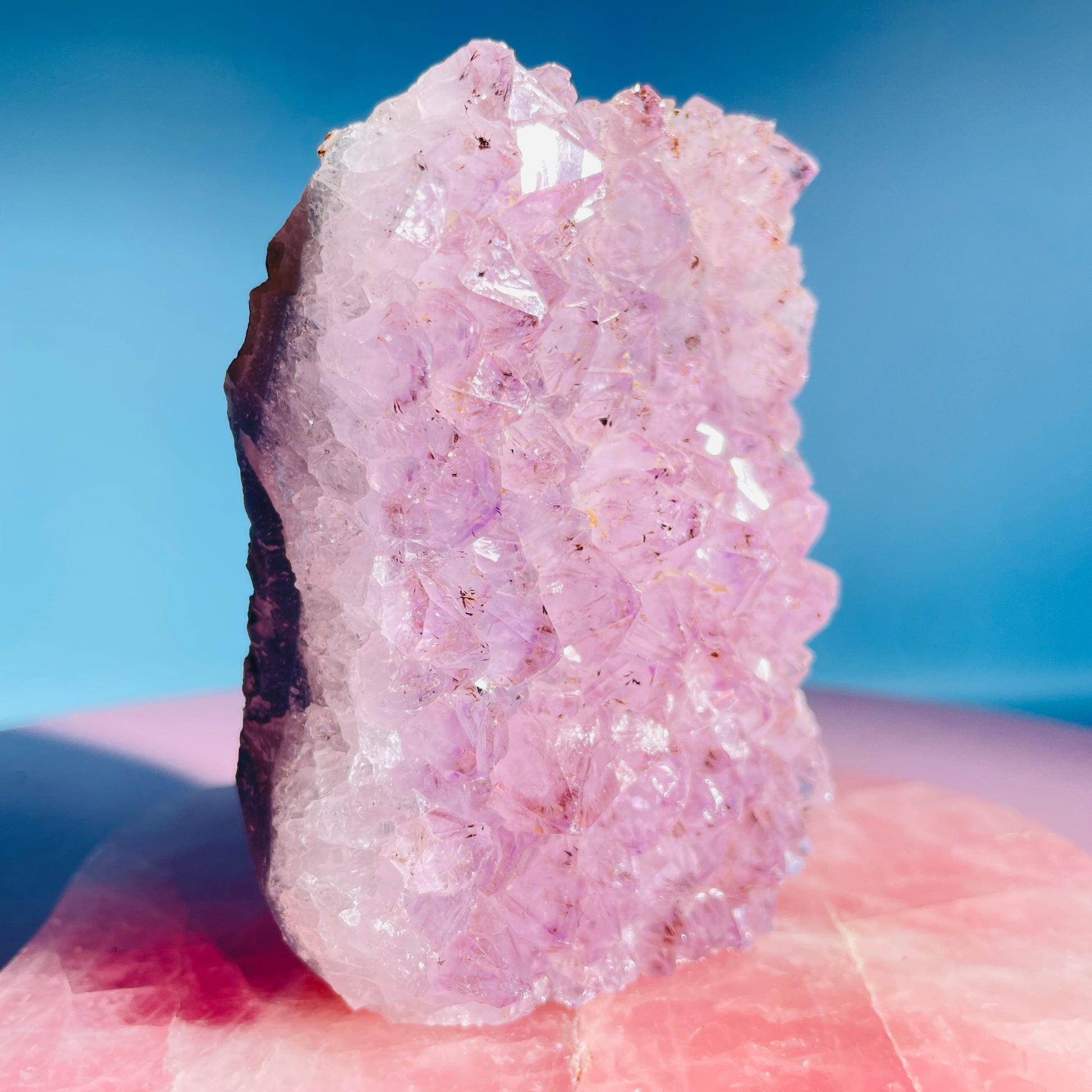 This piece has natural Cacoxenite inclusions within the Amethyst points.