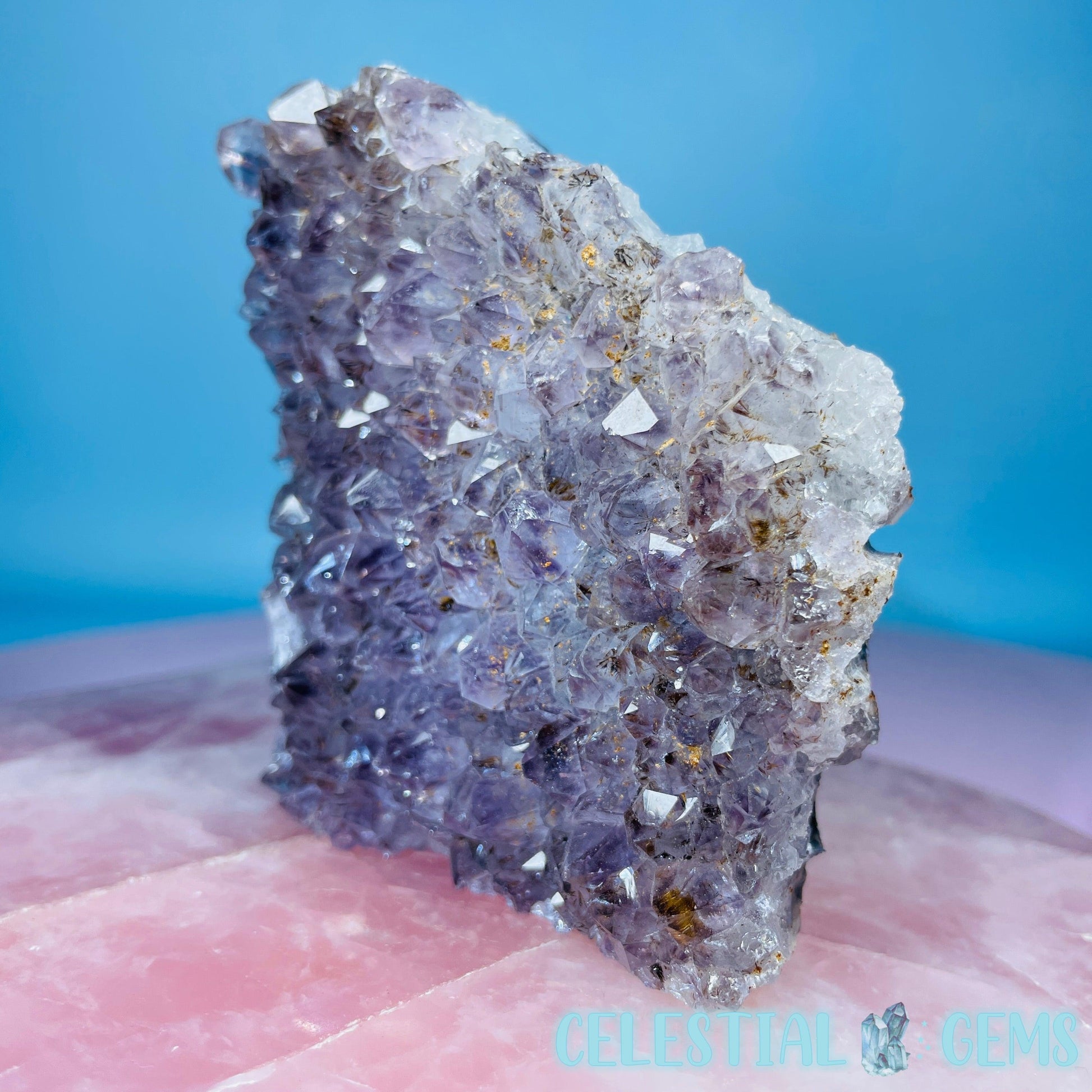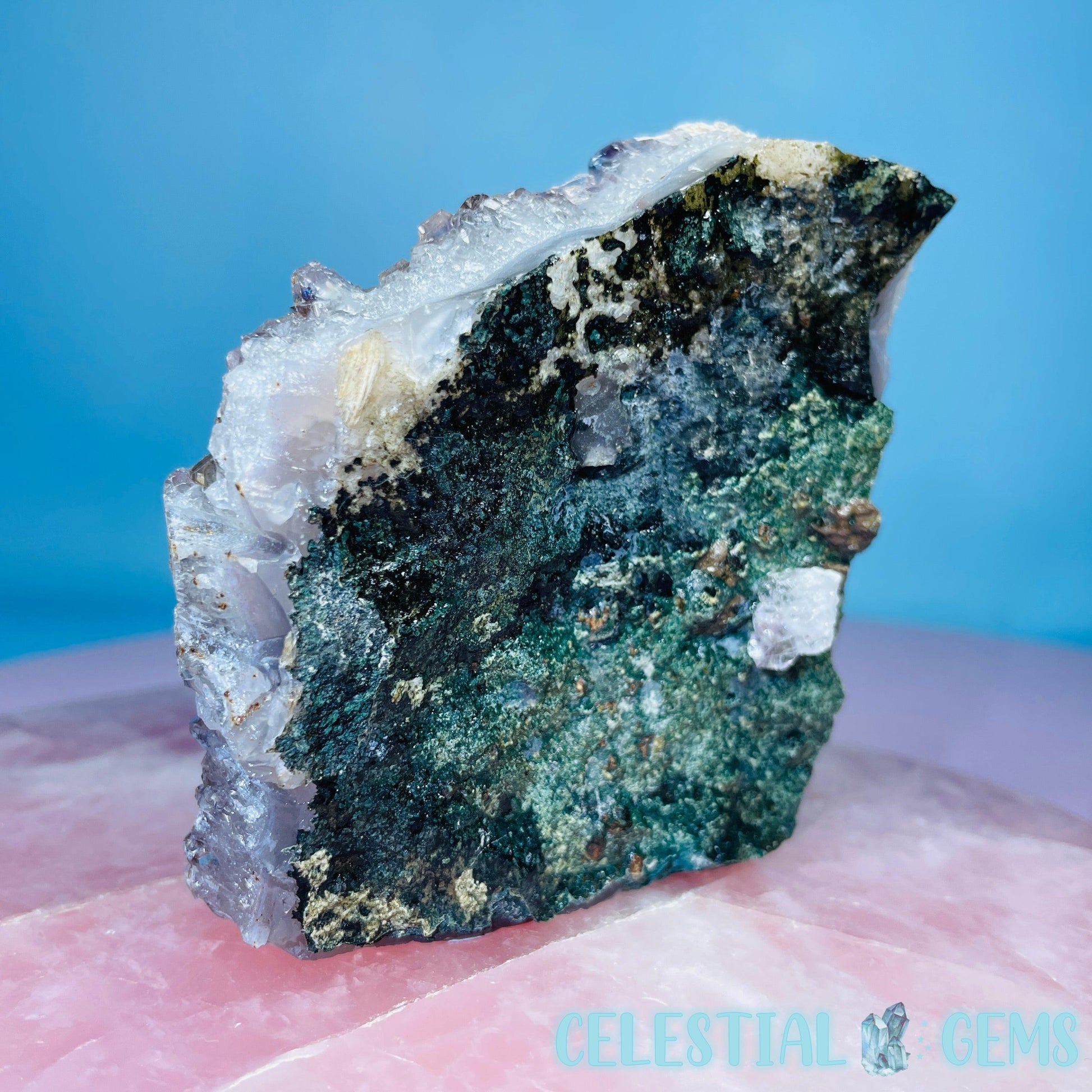 A stunning sparkly high grade Amethyst cluster with Cacoxenite phantom inclusions with Celadonite and Basalt on the rear. The edge is natural and unpolished with a flat cut bottom so it can stand on its own. Sourced from Brazil.