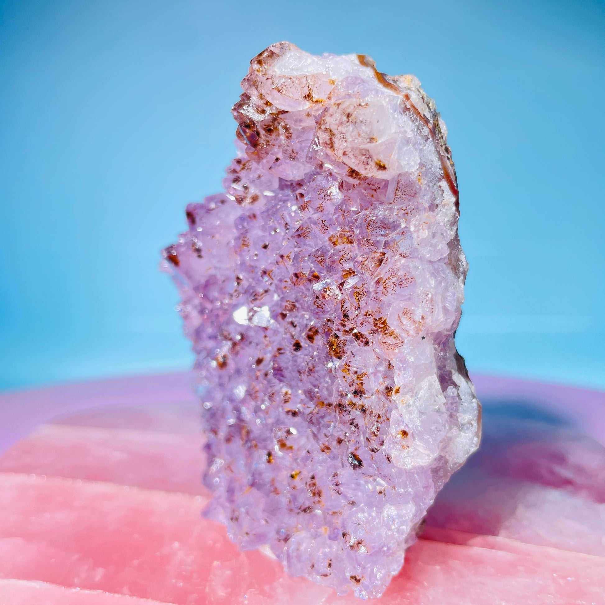 This piece has lovely Cacoxenite inclusions within the Amethyst points.