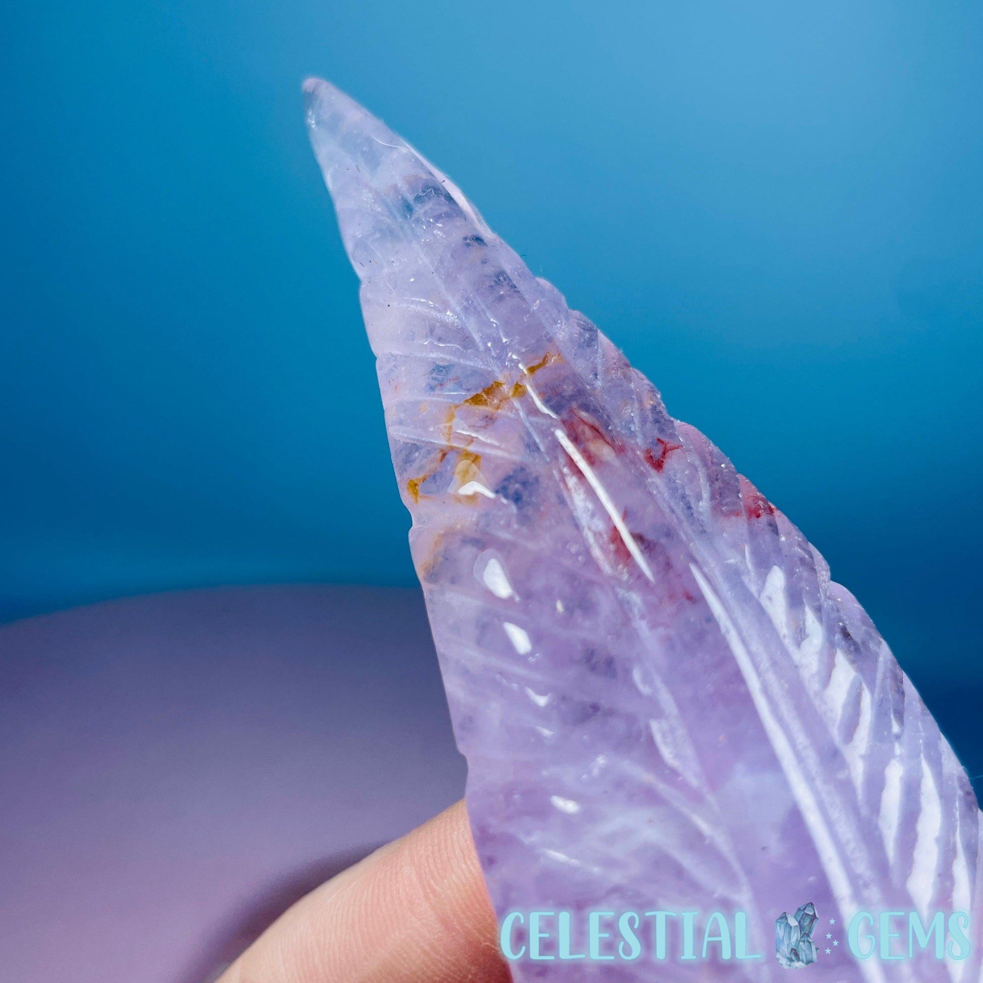 An Amethyst feather carving with red Hematite inclusions. Approx. 11.2cm x 3.3cm x 1.5cm.