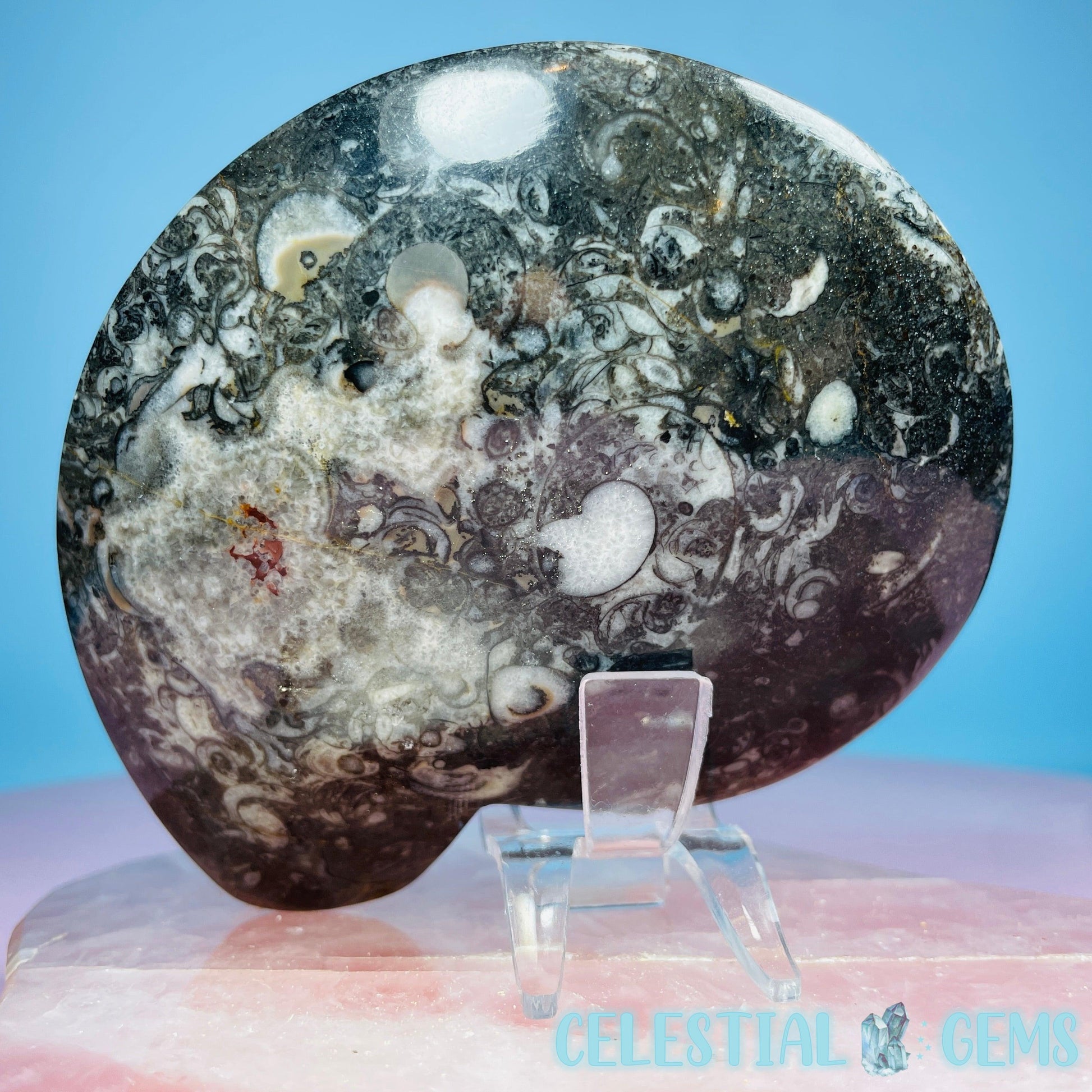 A spiral shell-shaped bowl / dish made from a fossiliferous limestone with Ammonite fossil inclusions and other animal remnants.