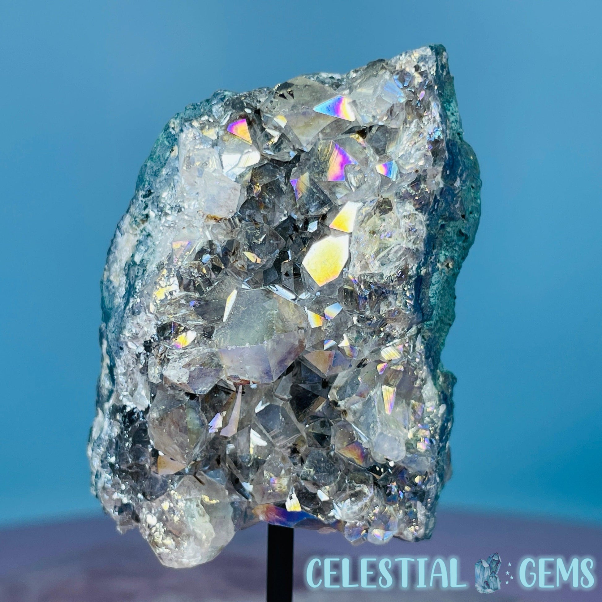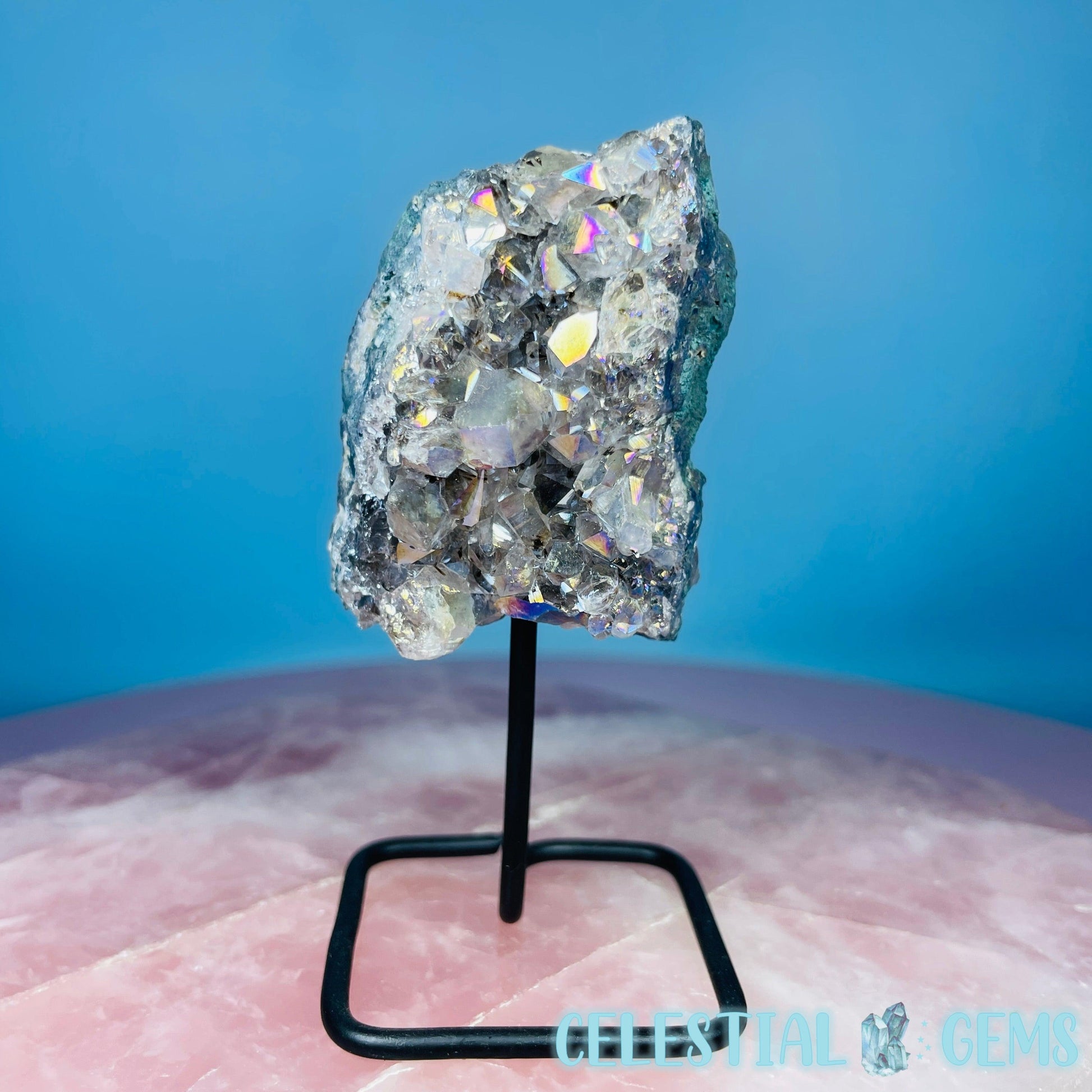 A small cluster of brazilian Amethyst with an aura shine, mounted on a metal 'lollipop' stand. Approx. 8.7cm tall x 4.3cm x 4.3cm base.