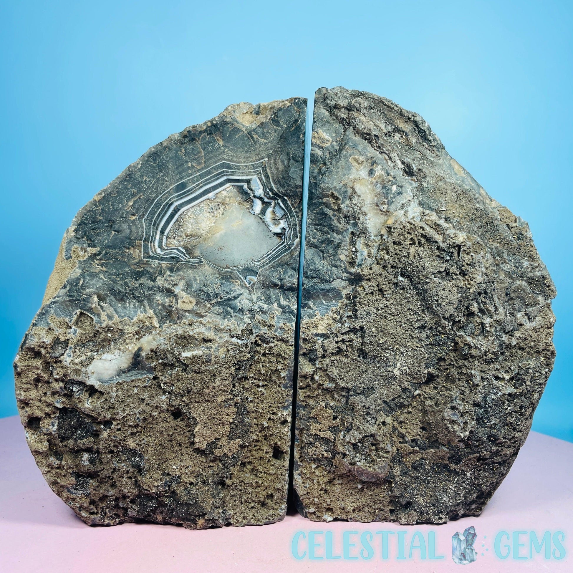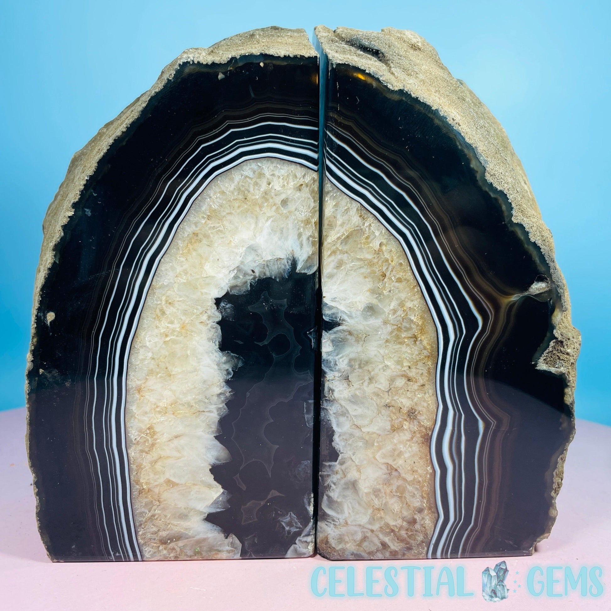 A gorgeous pair of cut and polished black Agate bookends (heat-treated). Approx. 18.5cm x 16cm x 7.1cm. Weight 3.78kg. Books sold separately.