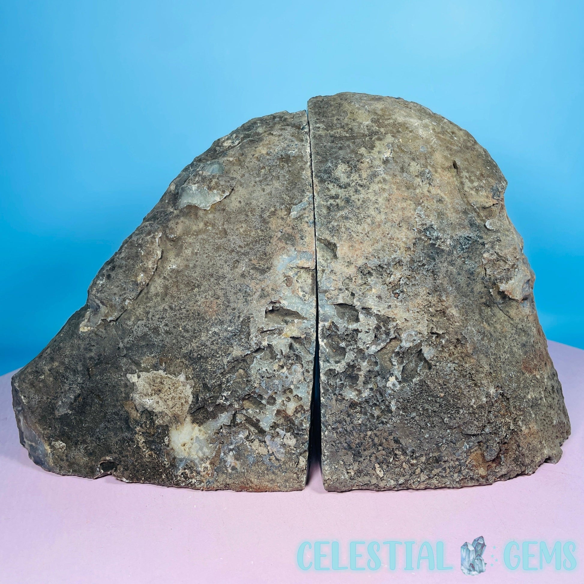 A gorgeous pair of cut and polished black Agate bookends (heat-treated). Approx. 24.4cm x 14.3cm x 8.3cm. Weight 3.7kg. Books sold separately.