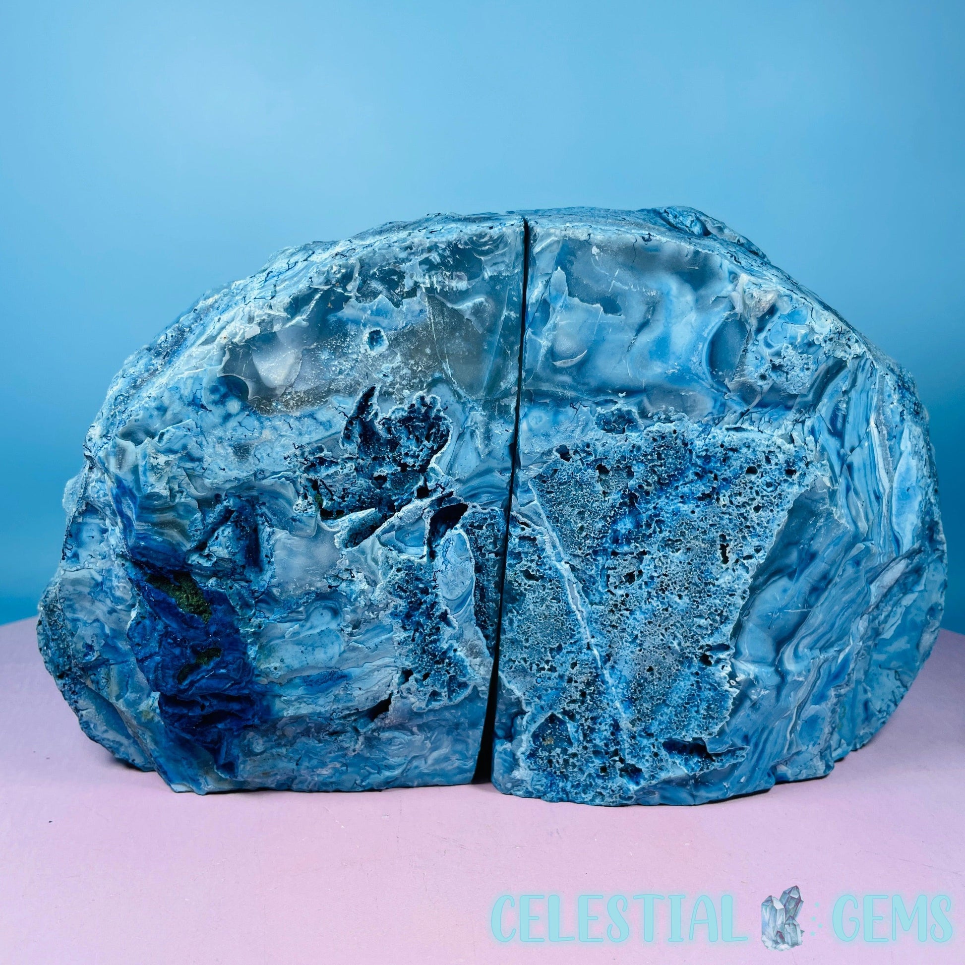 A gorgeous pair of cut and polished blue dyed Agate bookends. Approx. 22.2cm x 13.4cm x 16.5cm. Weight 3.33kg. Books sold separately.