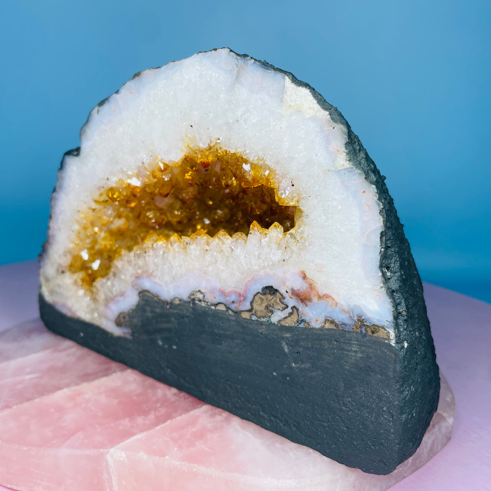 A gorgeous sparkly cluster of golden Citrine (heat-treated) with some Agate inclusions, polished and standing as a 'cave'. With a concrete rear and base. Mini-sized. Sourced from Brazil.