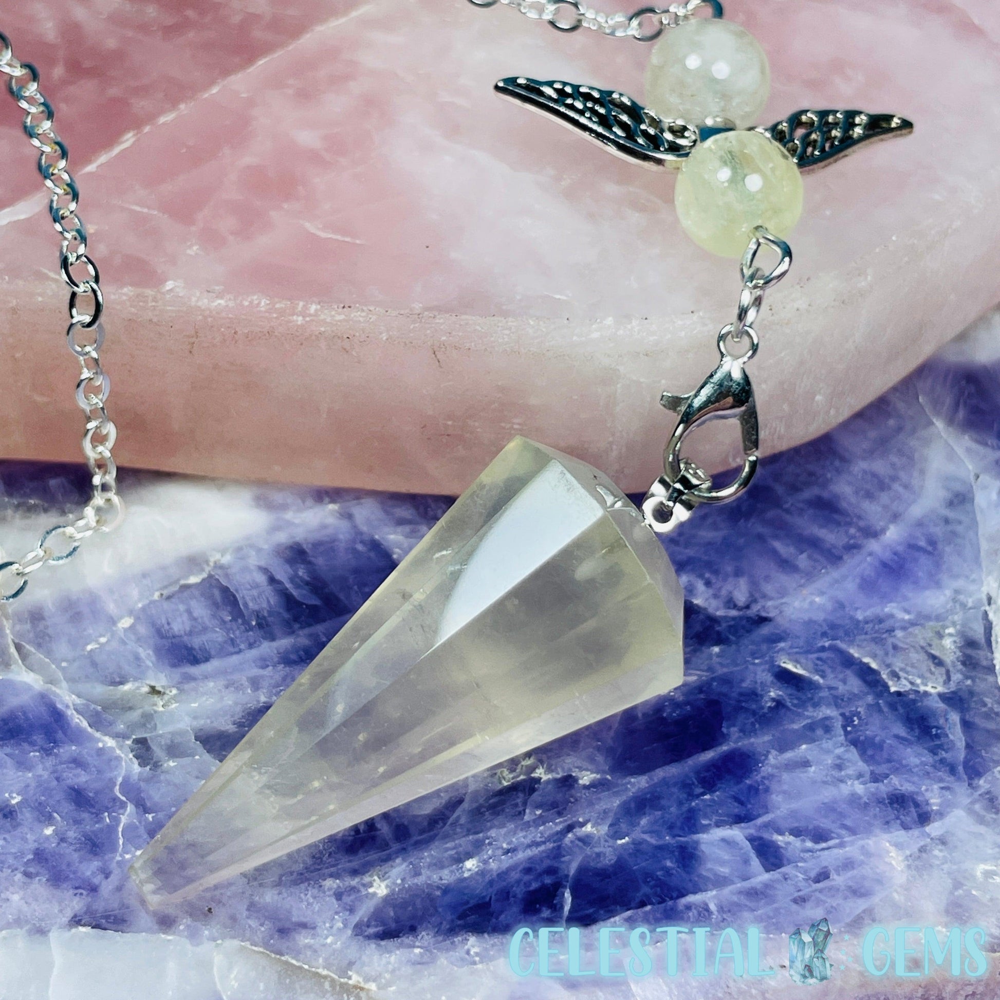 A 12-sided, perfectly vogel-cut crystal pendulum carved from natural Citrine with a 925 Sterling Silver clasp. Comes with a detachable chain with Citrine accent beads and metal angel wings.