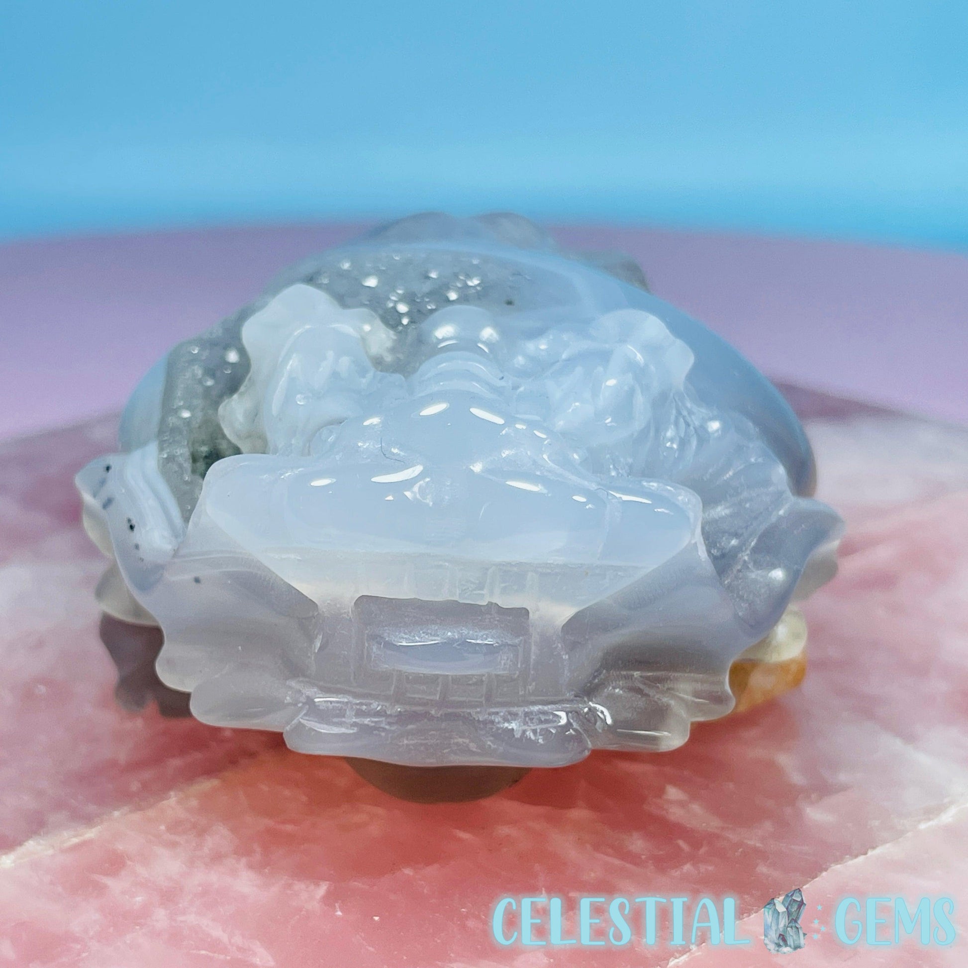 A sparkly druzy Agate carving of a Pixiu - a mythological creature from ancient Chinese culture which depicts the head of a dragon and the body of a frog (sometimes a lion). The Pixiu is a symbol of luck, fortune and is a protector of souls and the way of feng shui.