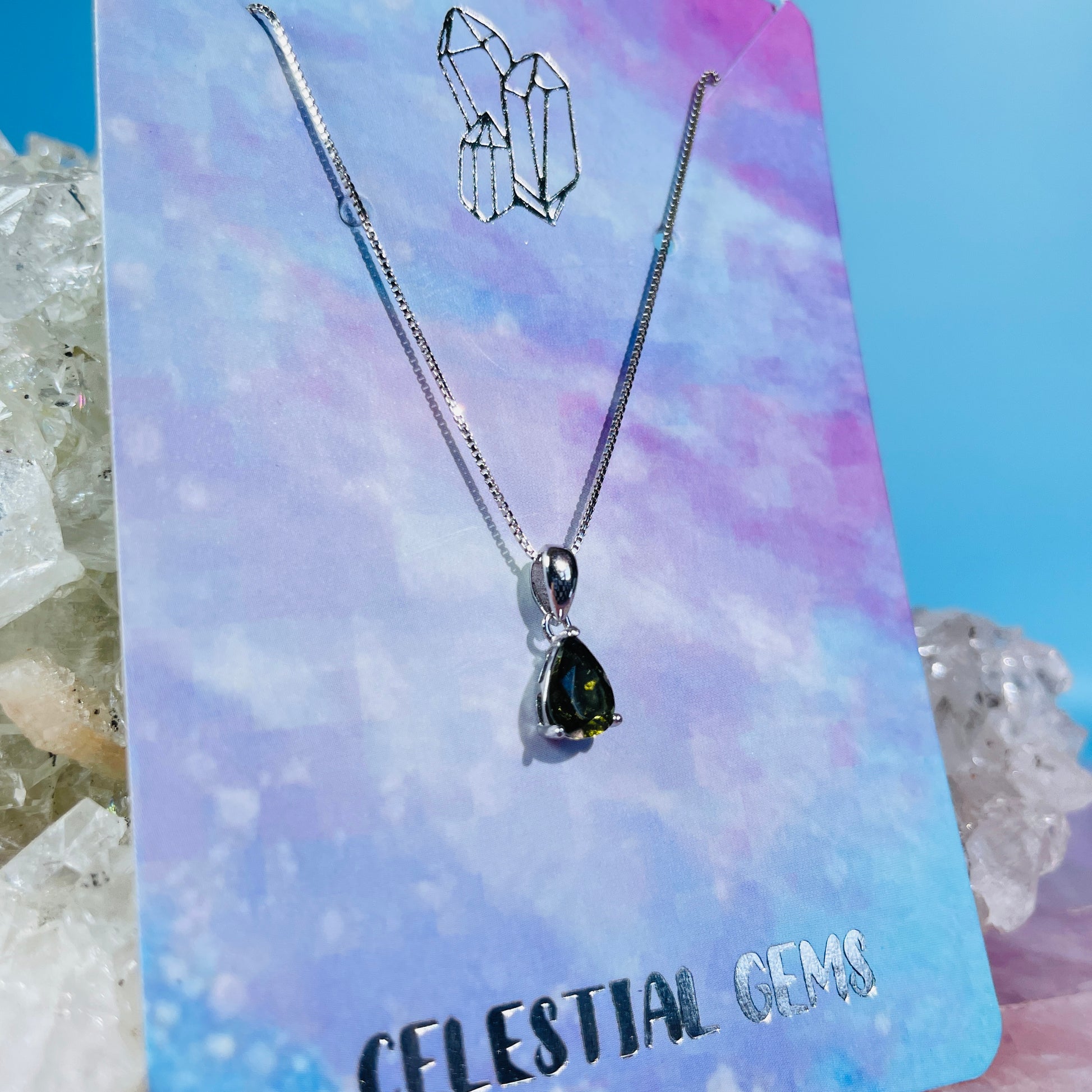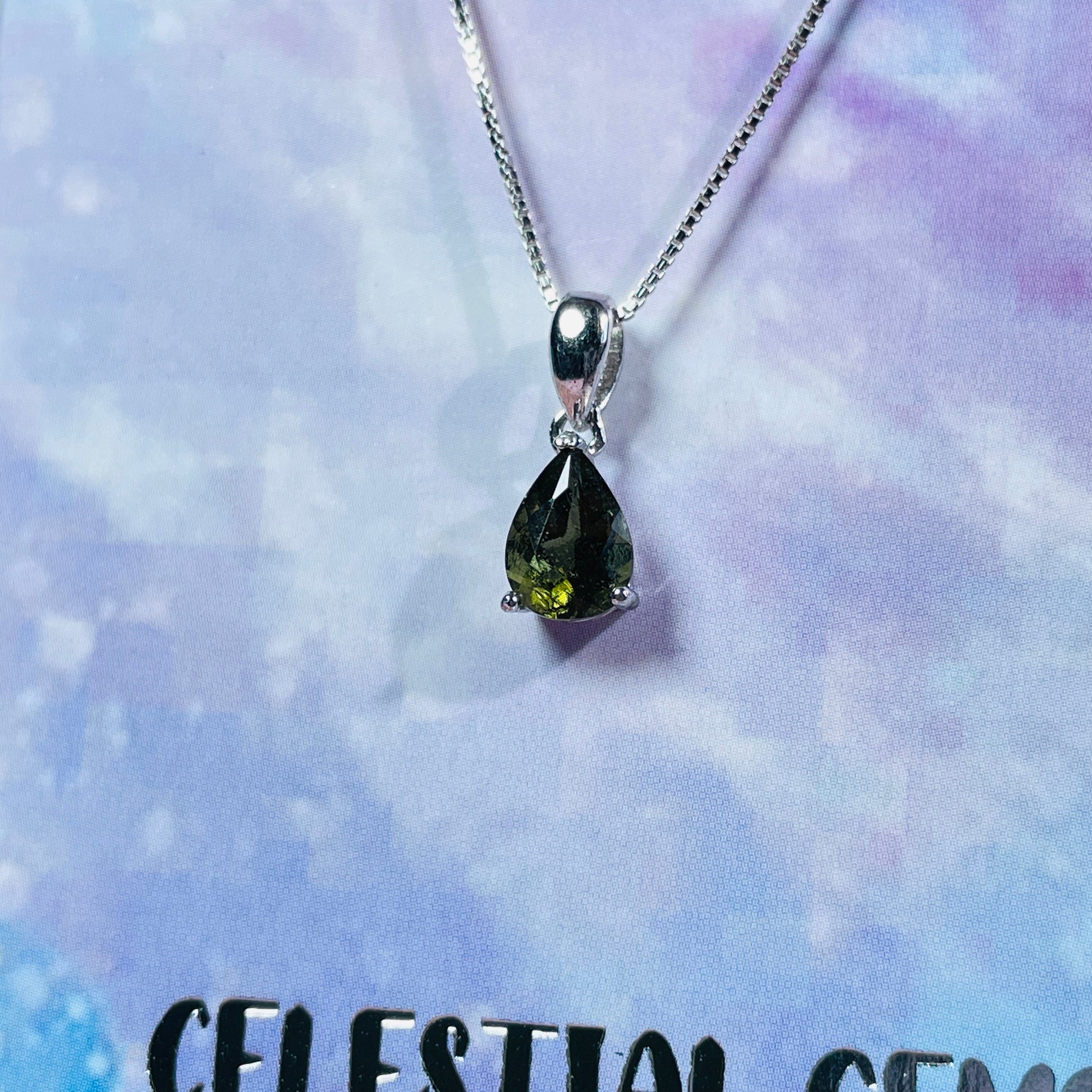 A stunning and rare Moldavite tektite faceted teardrop shaped pendant in a 925 Silver setting and chain necklace.