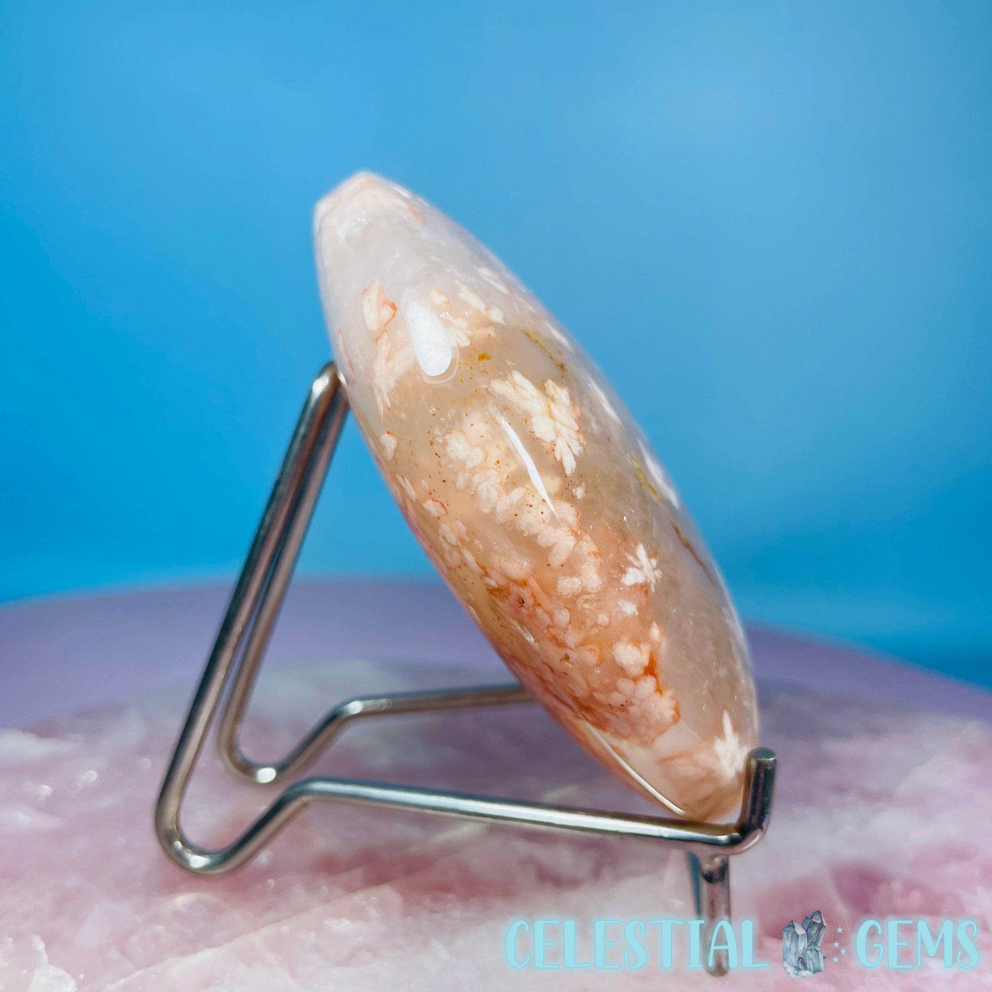 A beautiful crescent moon carved and polished from peachy Flower Agate inside sparkly Quartz. Approx. 8.5cm x 6.5cm x 2.7cm. Stand sold separately.