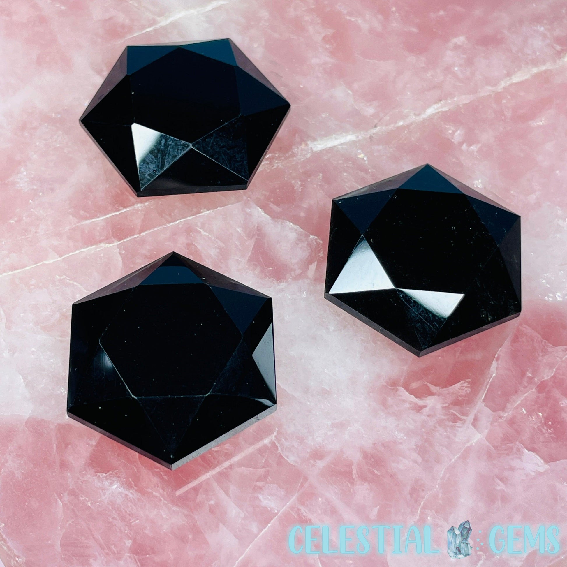 A high grade of Obsidian with excellent colour and shine, carved into a hexagram star shape to be used as a pocket stone. Approx. 3.2cm x 3.2cm x 1cm. Sold individually. One will be chosen randomly for you.