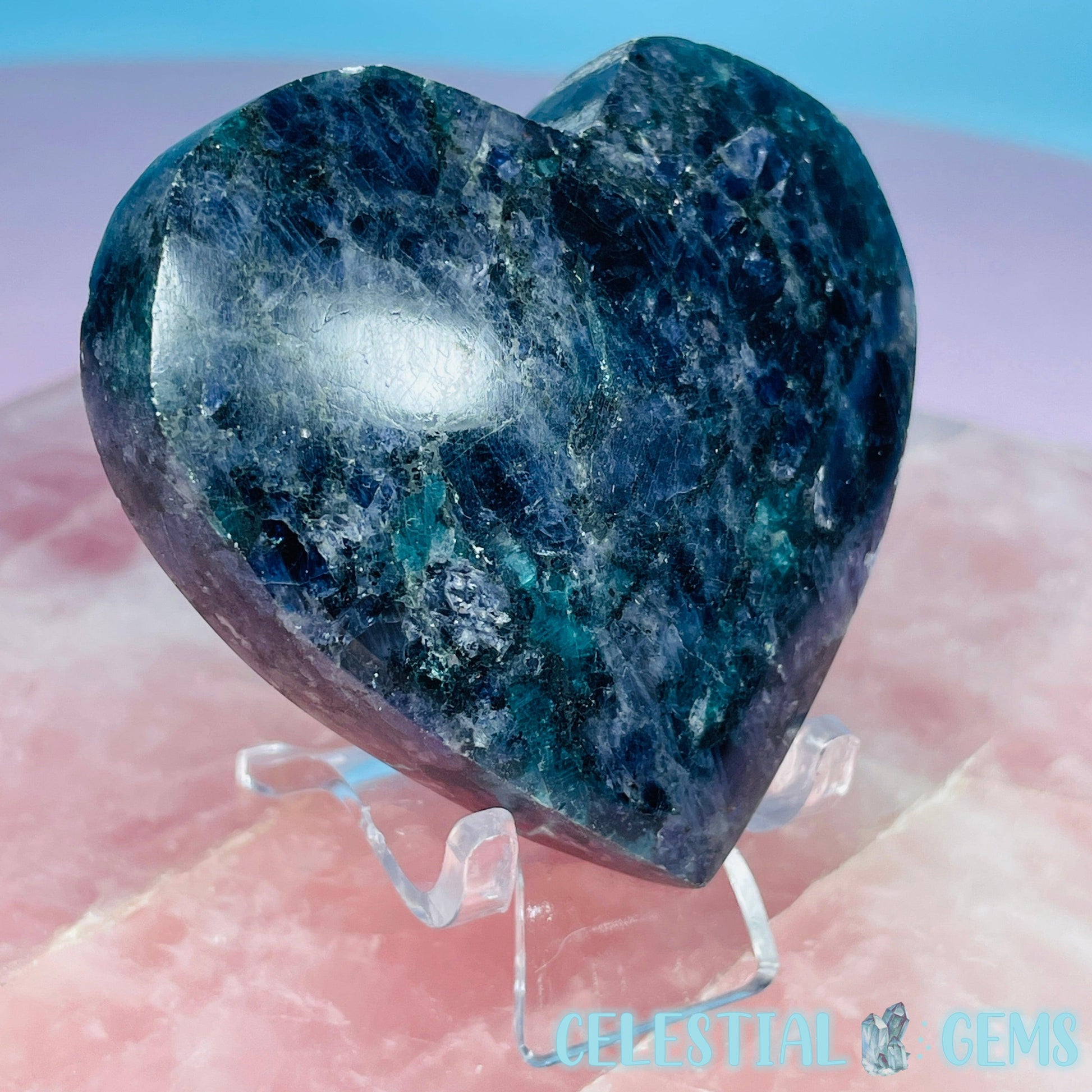 A dark Iolite heart with excellent navy blue/indigo colour and light blue Apatite crystals inside. Approx. 5.9cm x 5.5cm x 2.1cm. Stand sold separately.