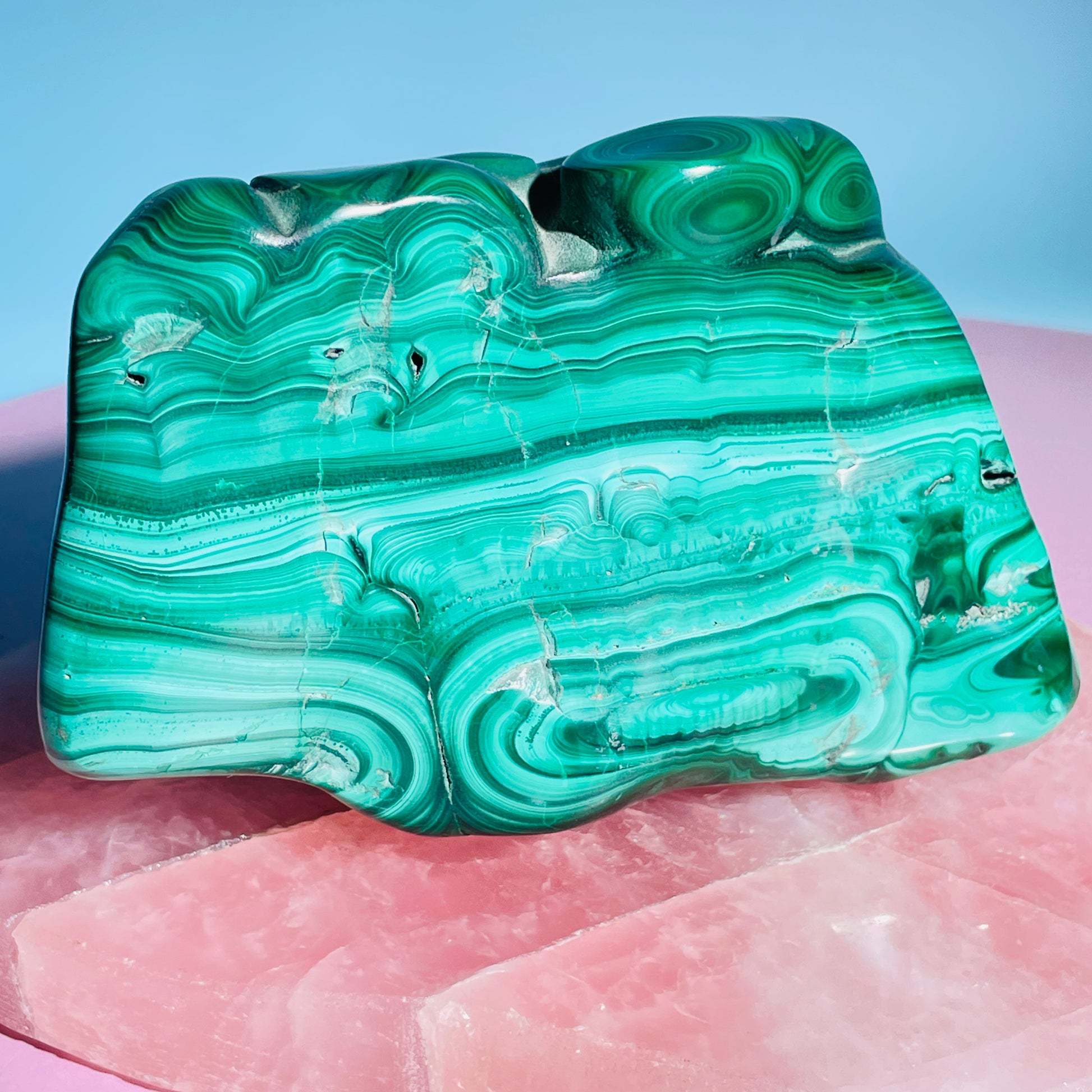 A semi-polished chunky natural freeform of banded green Malachite with gorgeous patterns and thick layers. Sourced from DRC Congo.