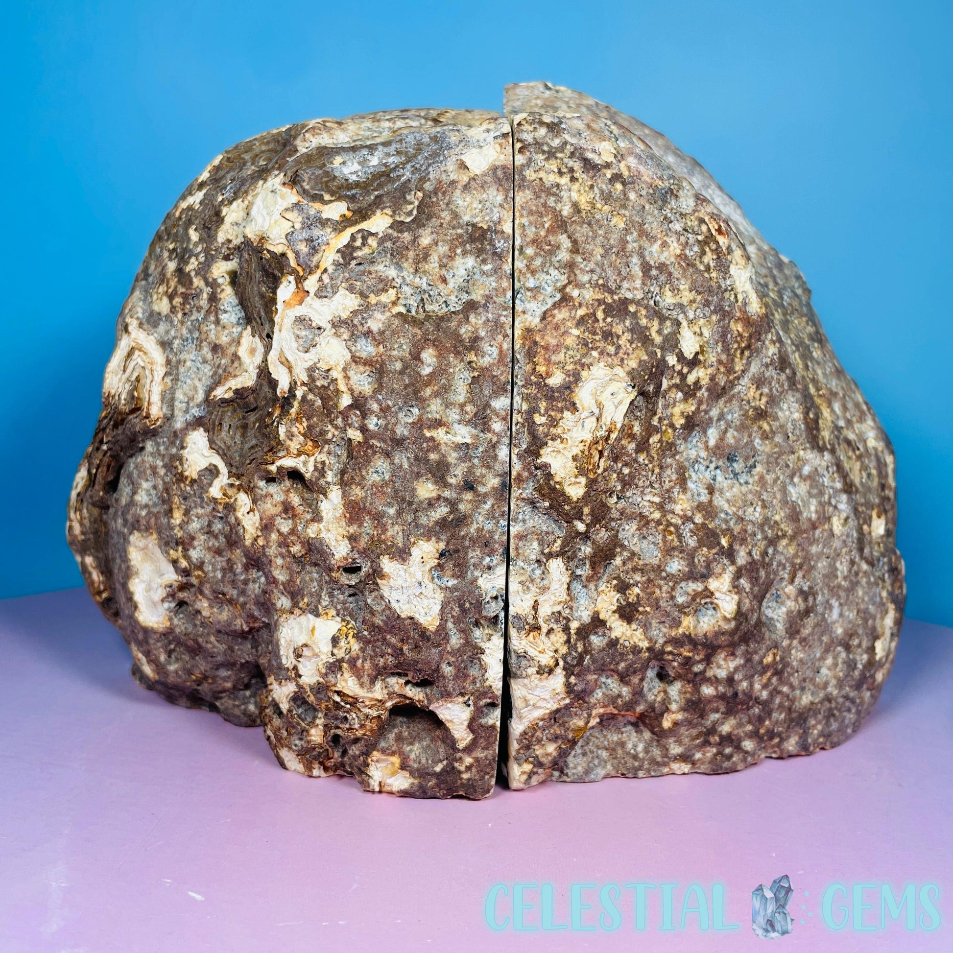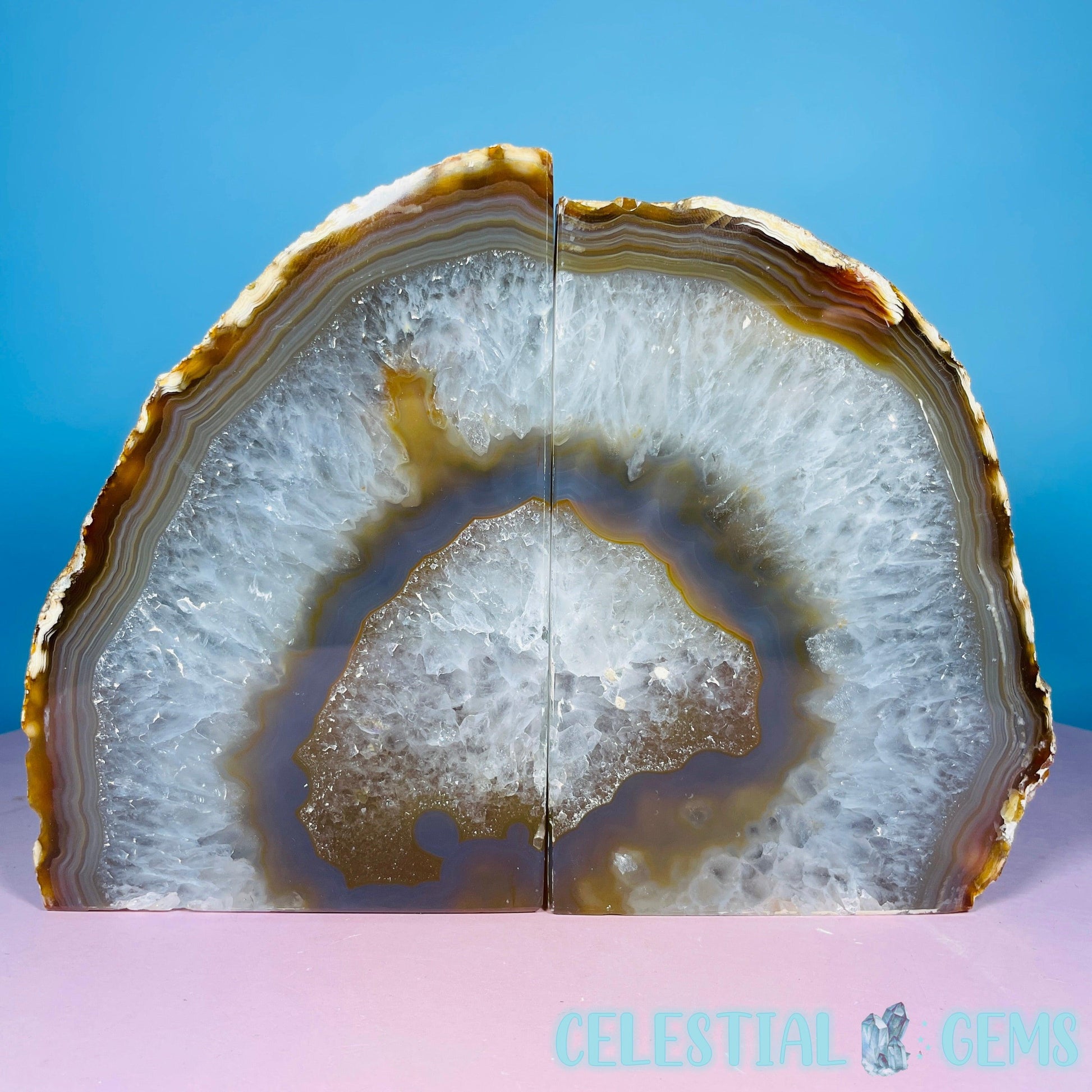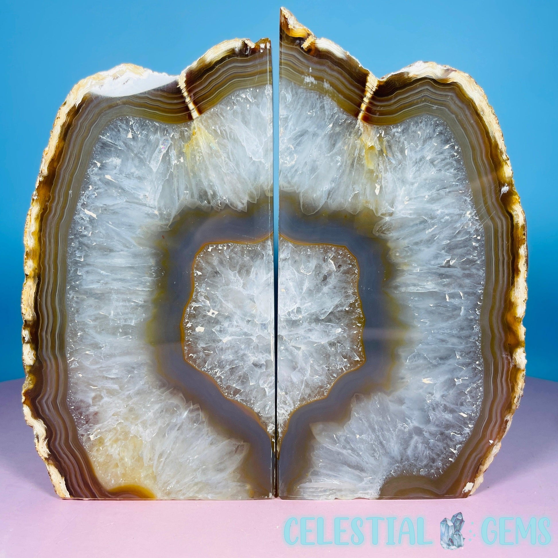 A gorgeous pair of cut and polished natural Agate bookends. Approx. 17.6cm x 14cm x 7.5cm. Weight 2.8kg. Books sold separately.