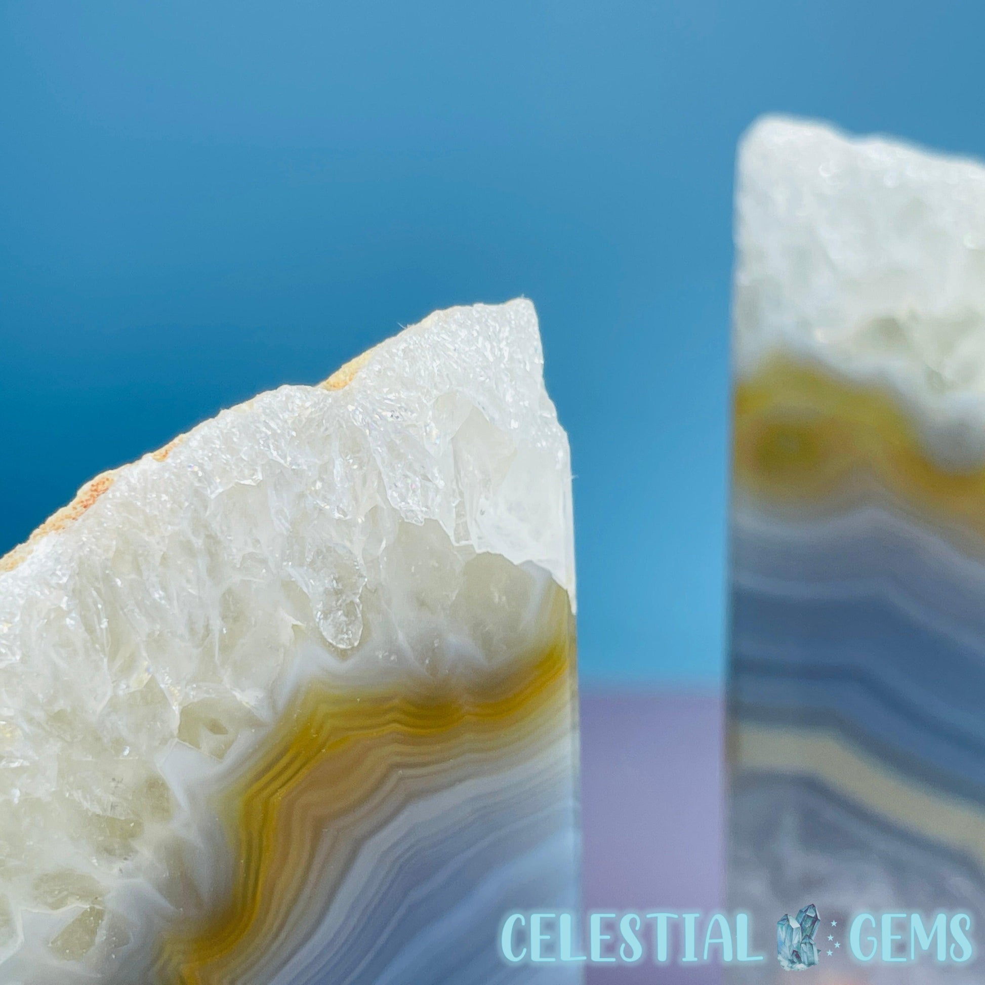 A gorgeous pair of cut and polished natural Agate bookends. Approx. 15cm x 14.8cm x 7.7cm. Weight 2.29kg. Books sold separately.