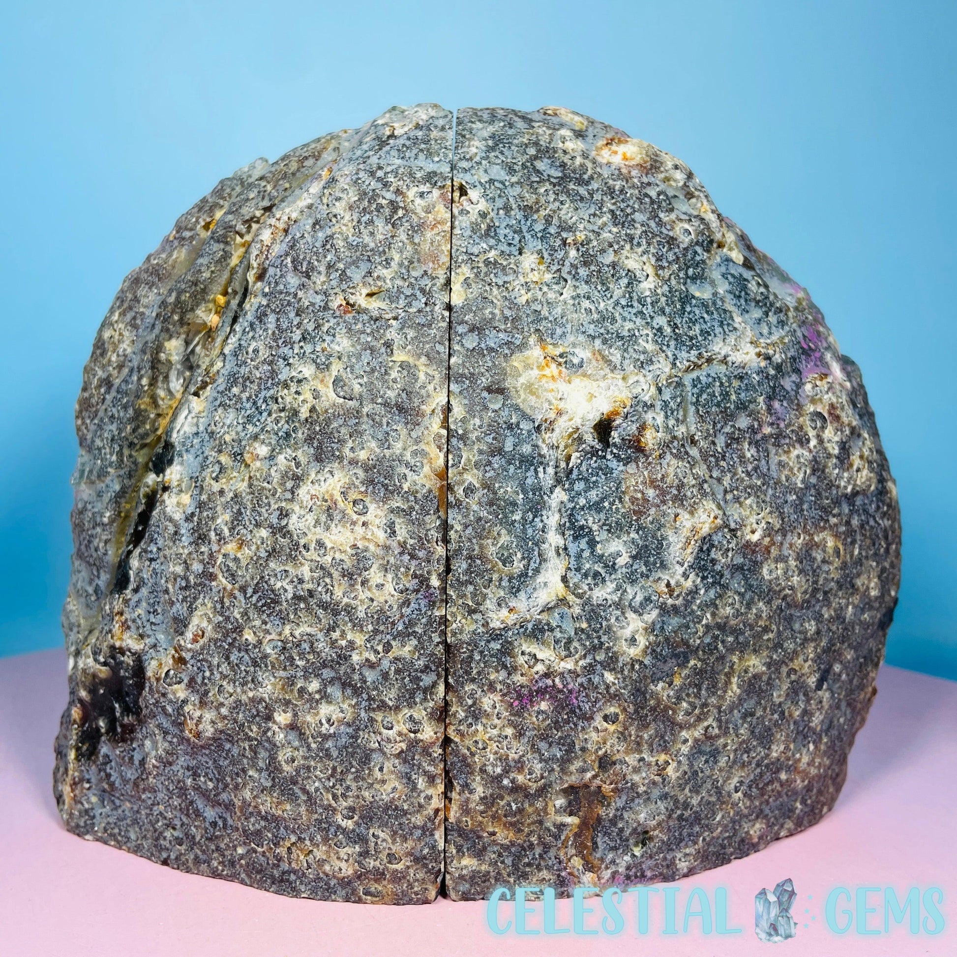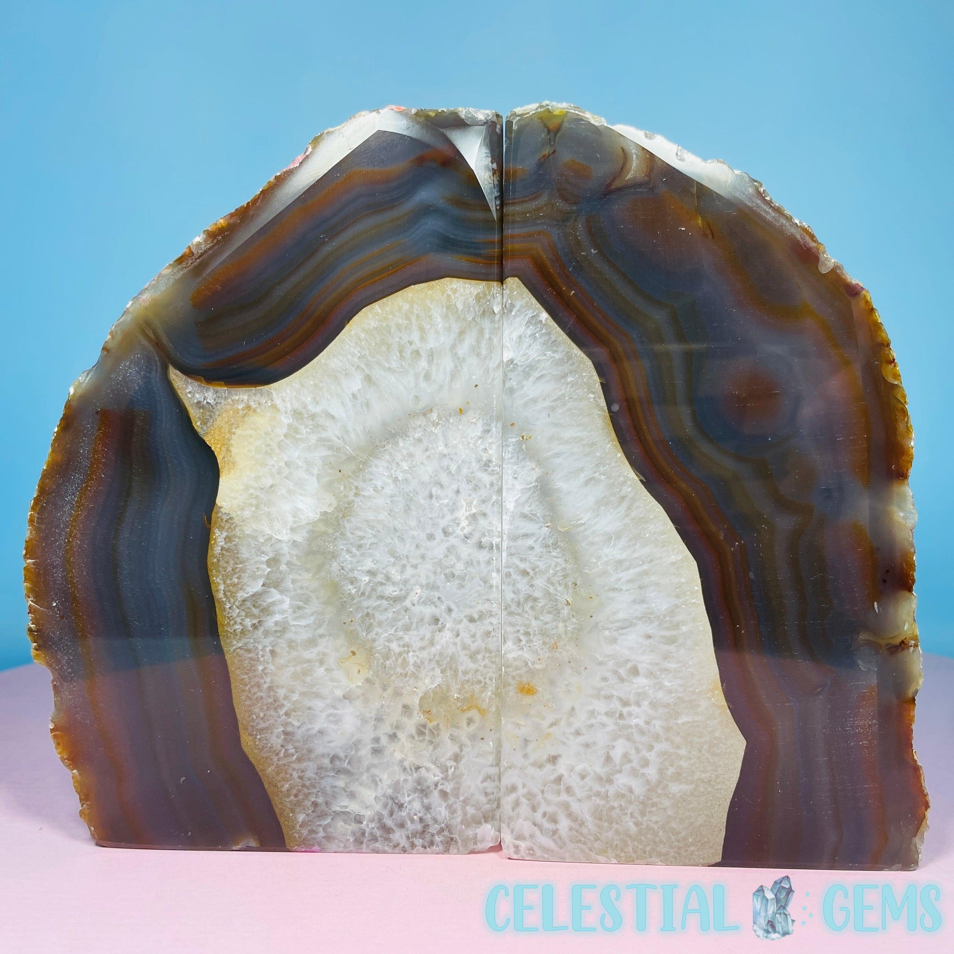 A gorgeous pair of cut and polished natural Agate bookends. Approx. 18cm x 15cm x 5.4cm. Weight 1.93kg. Books sold separately.
