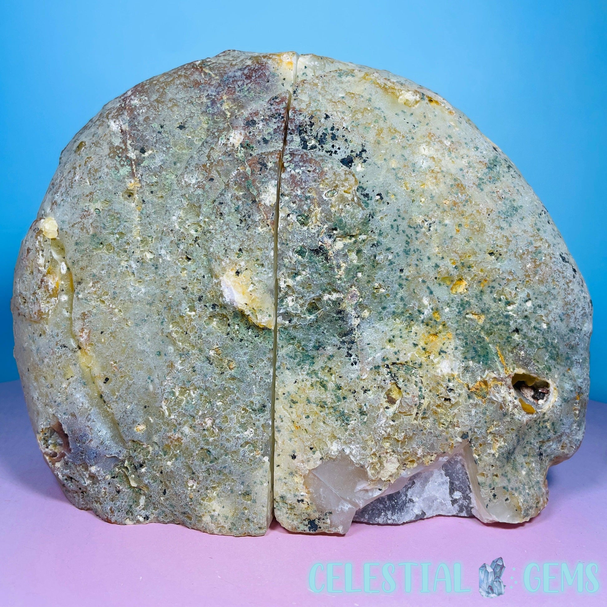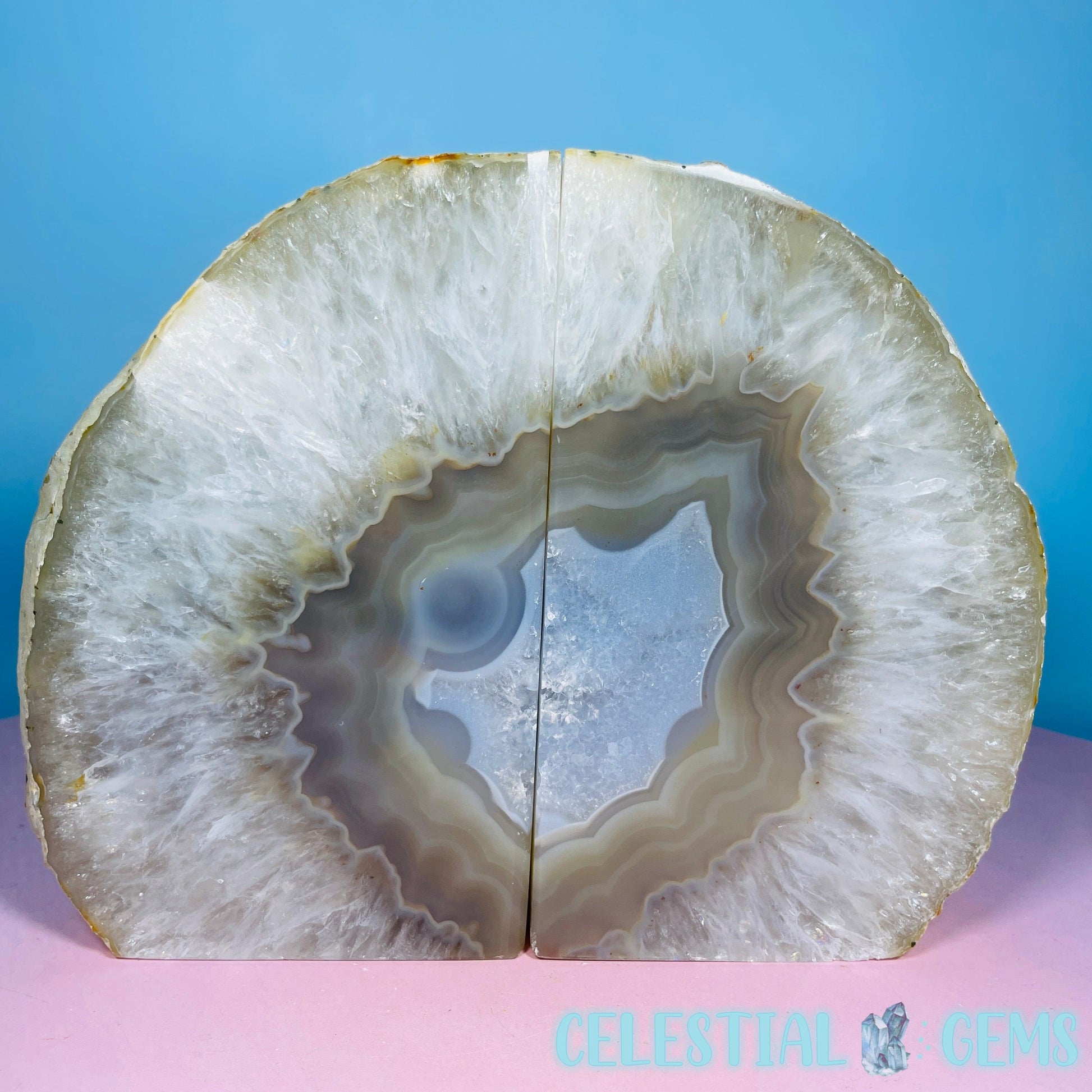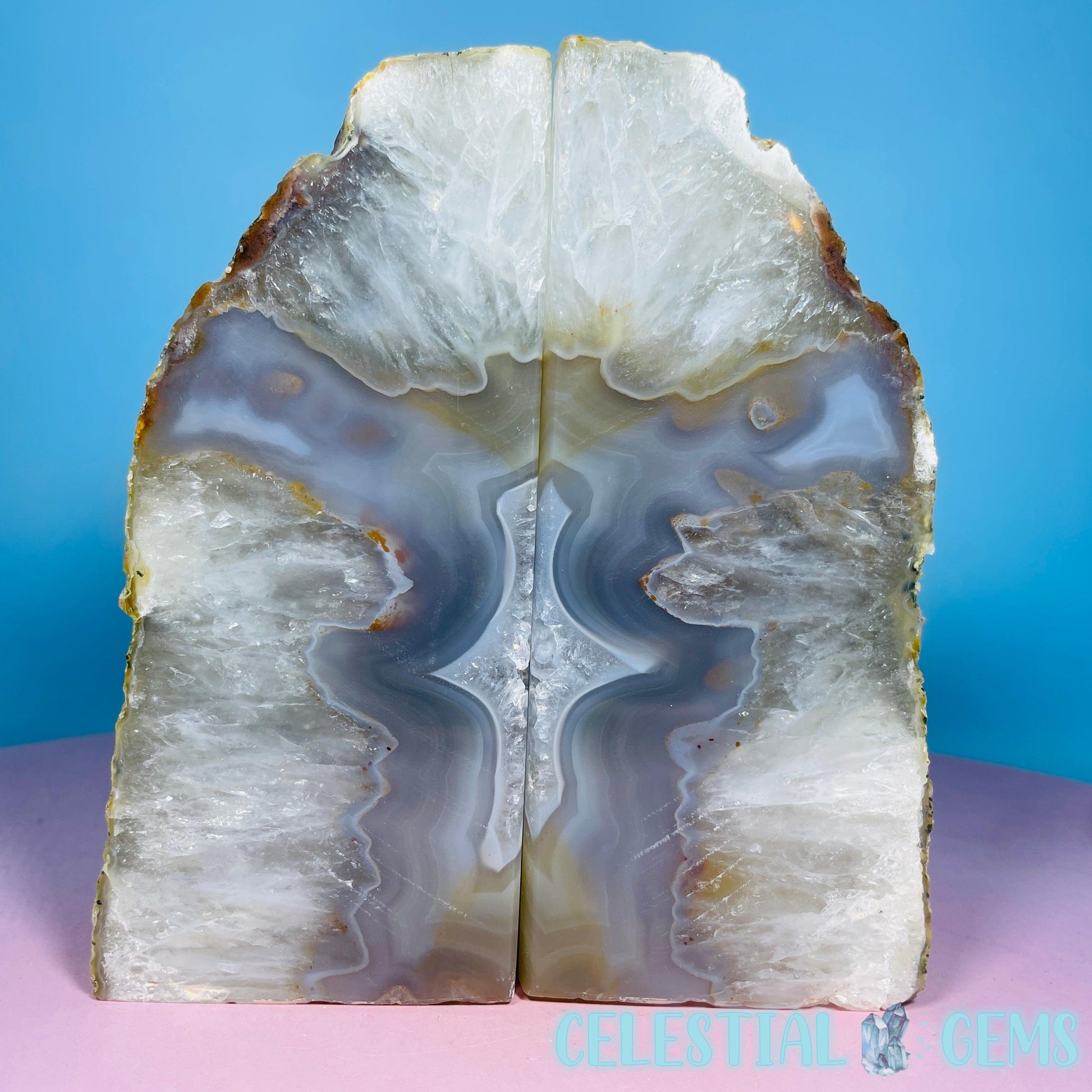 A gorgeous pair of cut and polished natural Agate bookends. Approx. 18cm x 13.8cm x 6.3cm. Weight 2.55kg. Books sold separately.