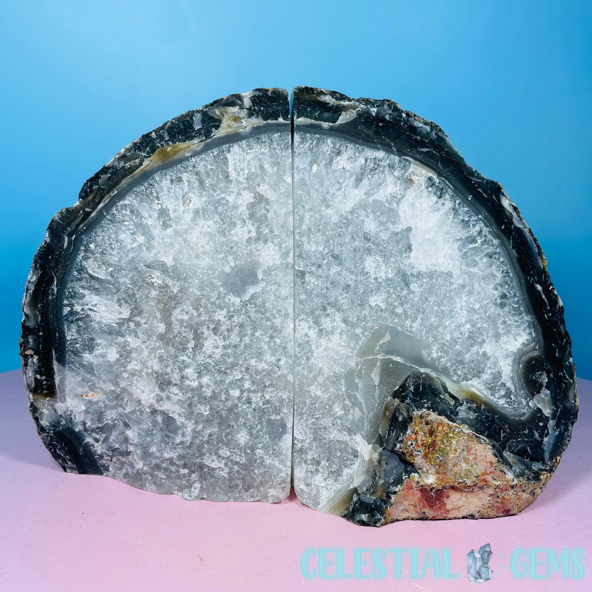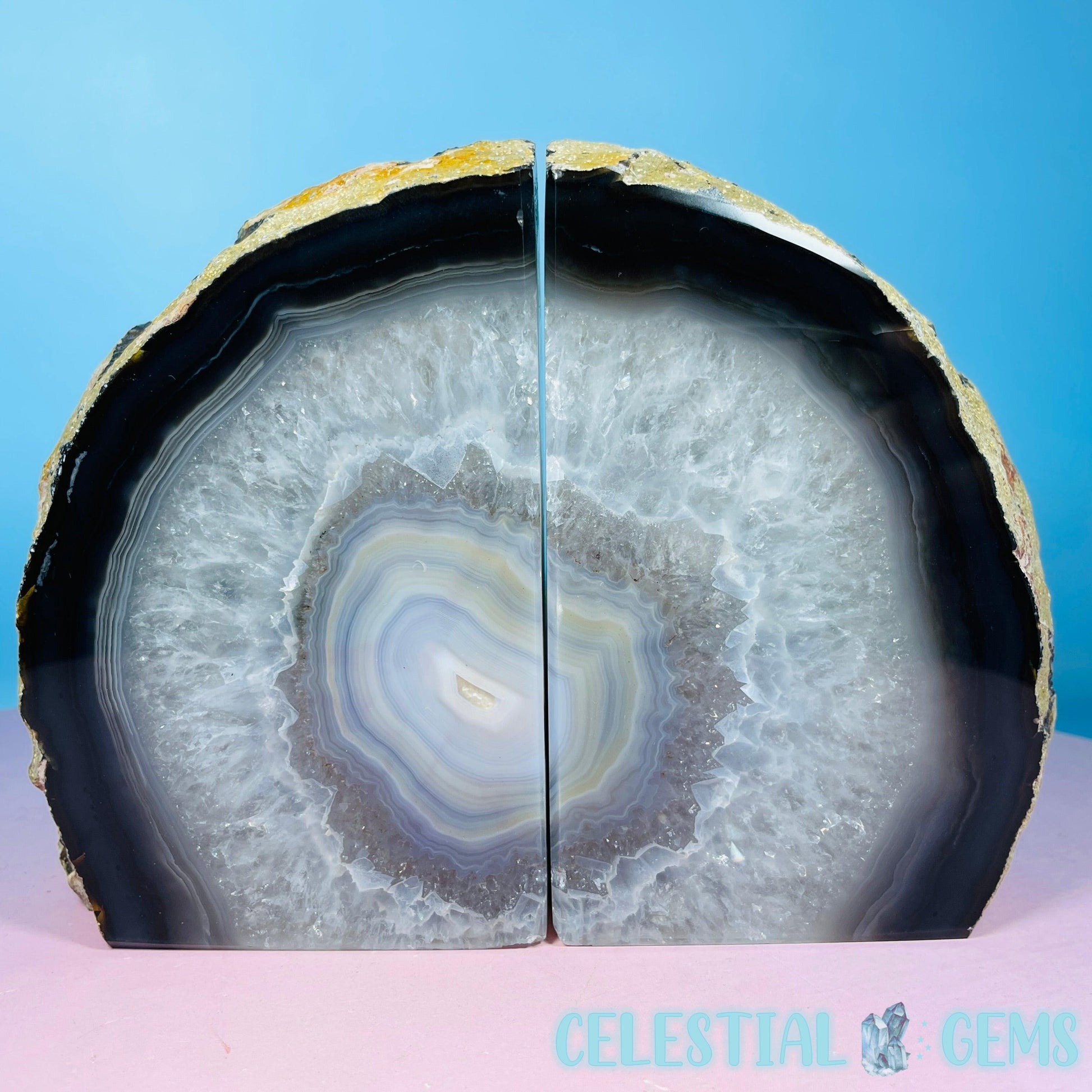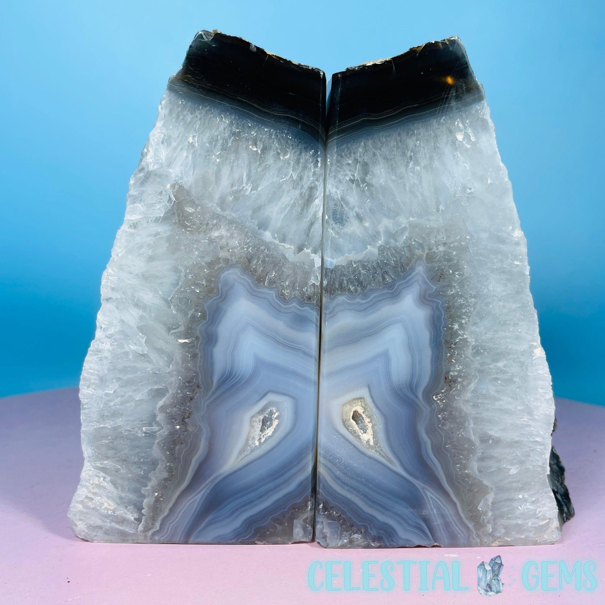 A gorgeous pair of cut and polished natural Agate bookends. Approx. 17.8cm x 12.4cm x 7.7cm. Weight 2.13kg. Books sold separately.