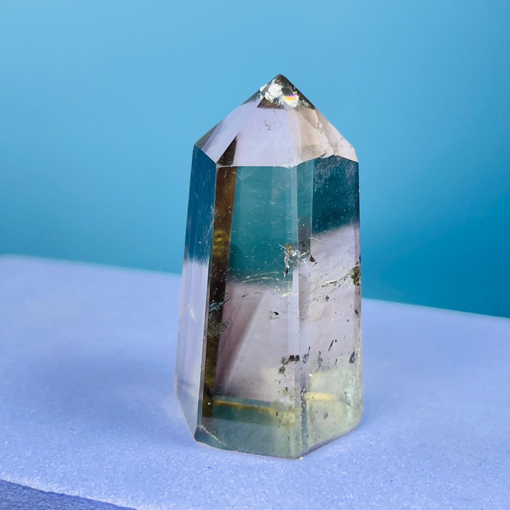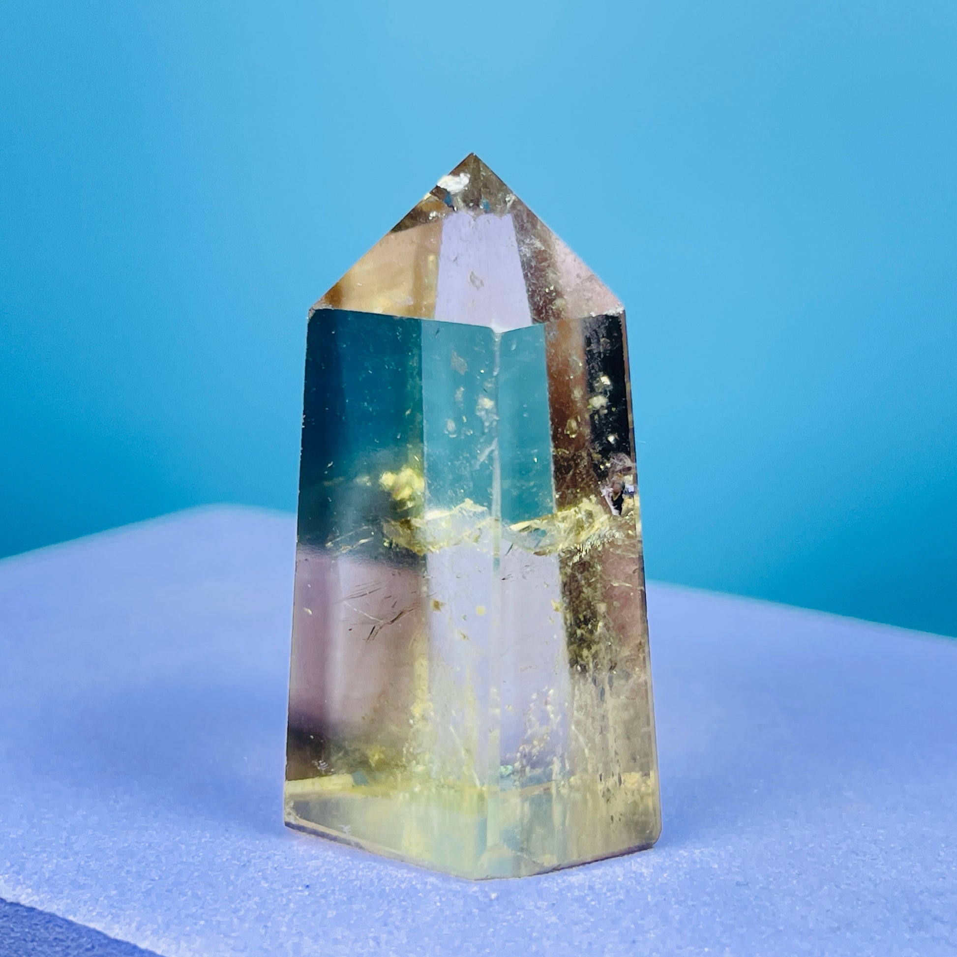 A small polished standing point of natural yellow Citrine with Smoky Phantom colouration. Sourced from Brazil.