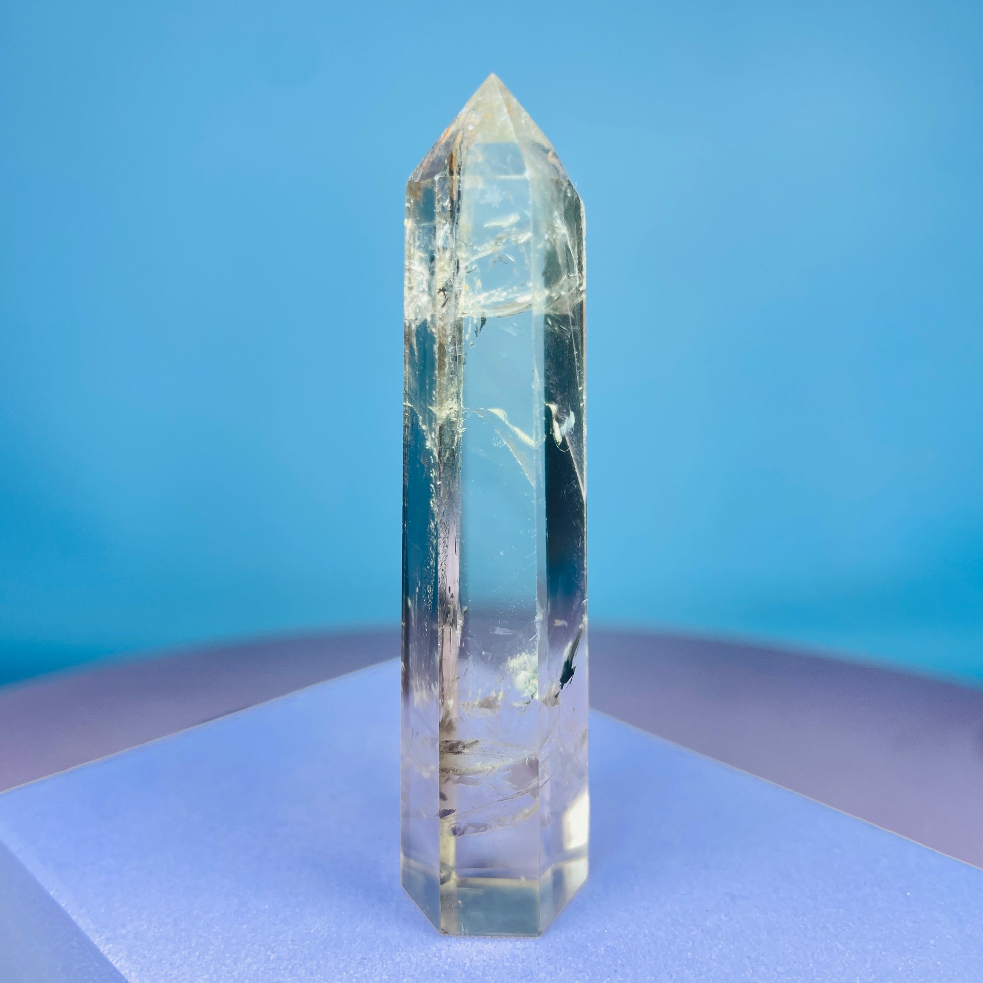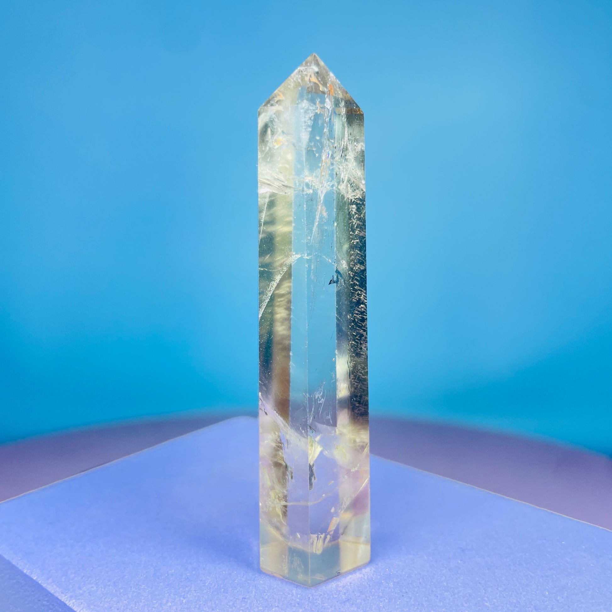 A small polished standing tower of natural yellow Citrine with Smoky Phantom colouration. Sourced from Brazil.