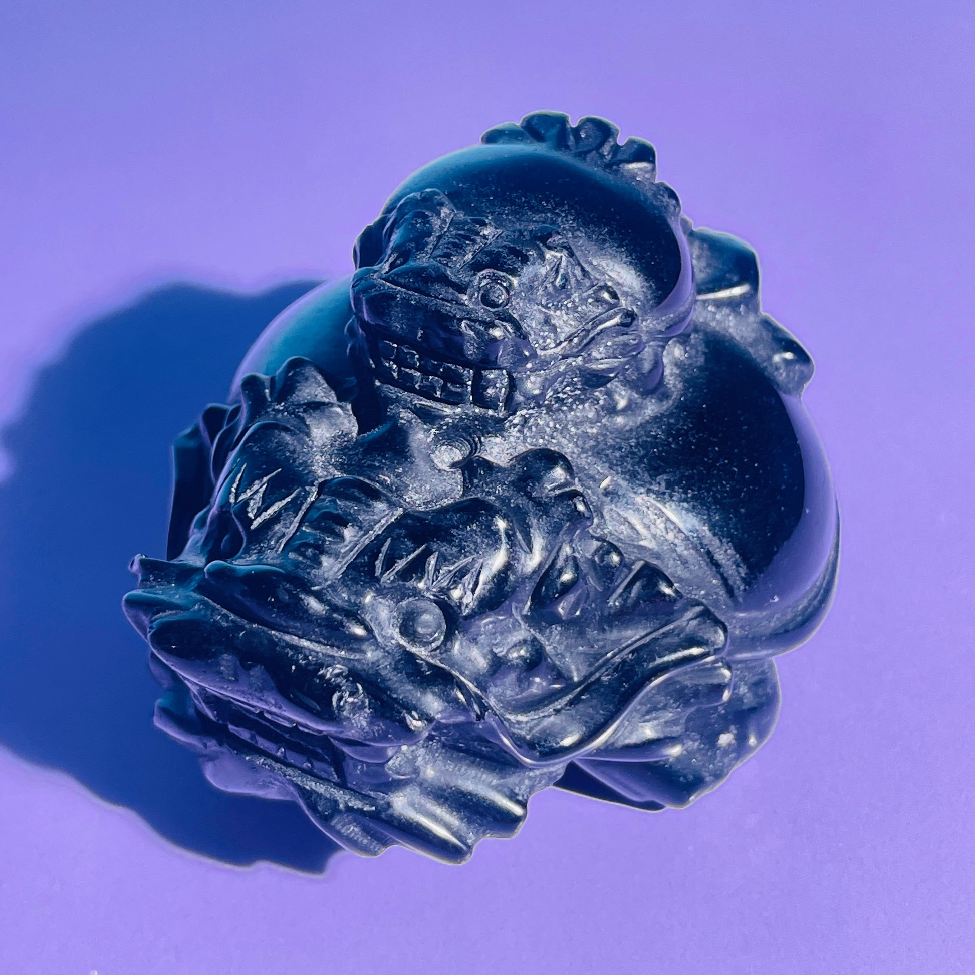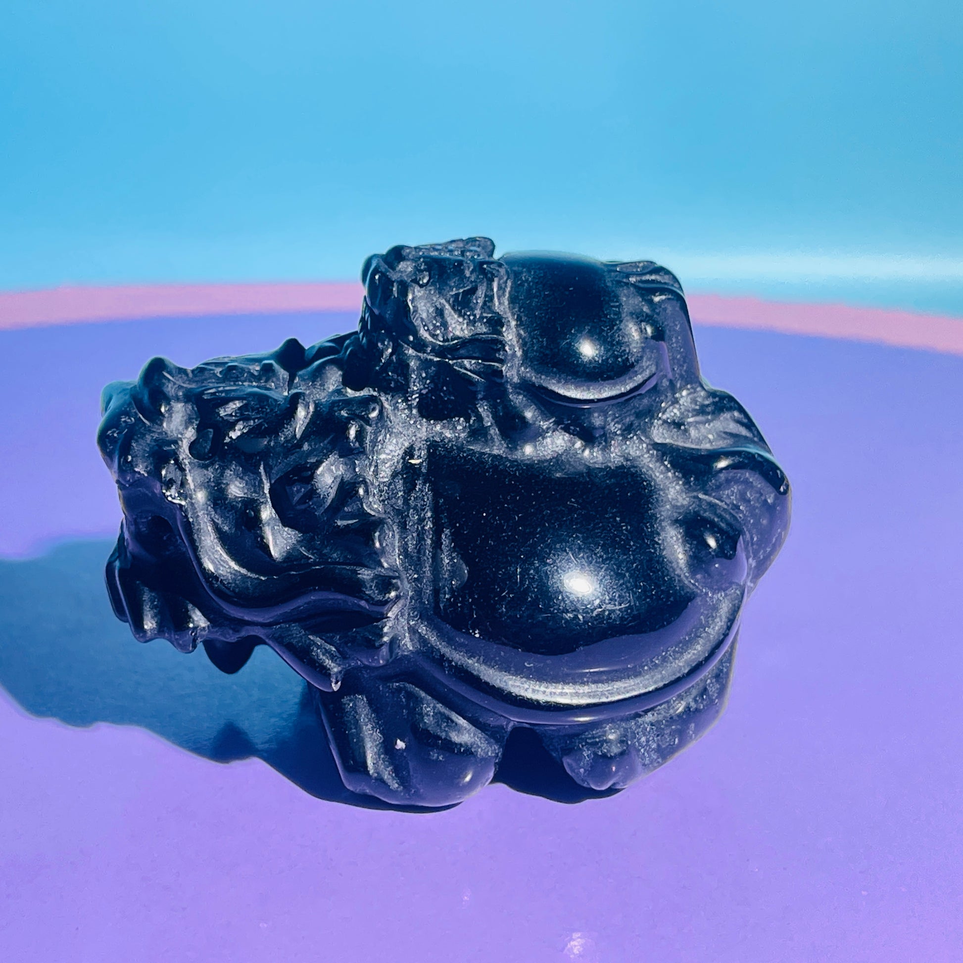 An Obsidian carving of a Pixiu - a mythological creature from ancient Chinese culture which depicts the head of a dragon and the body of a frog, turtle or lion. The Pixiu is a symbol of luck, fortune and is a protector of souls and the way of feng shui.