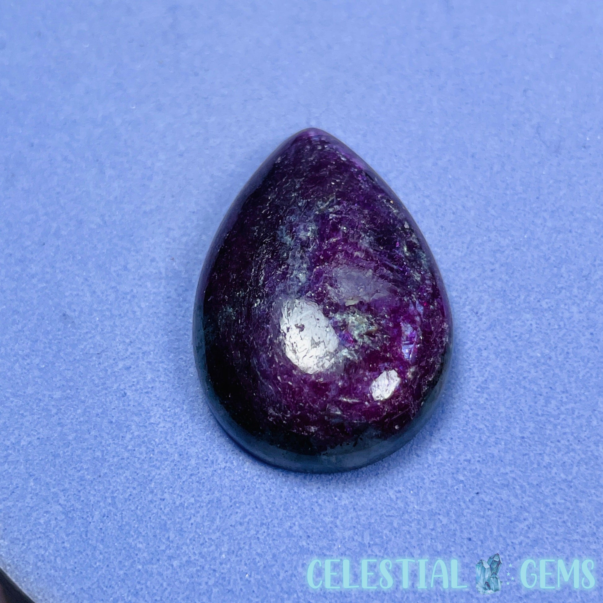 A high grade Ruby teardrop cabochon with excellent colour and some flash. This Ruby is extremely UV reactive and will glow bright pink/red when exposed to a UV light. Has some Quartz matrix. Approx. 2.7cm x 1.8cm x 0.7cm.