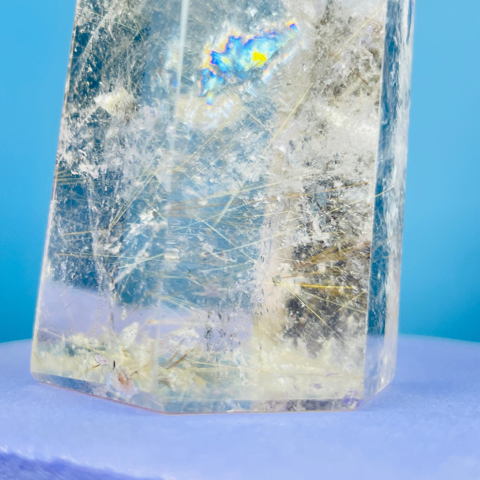 A stunning inclusion Smoky Quartz small tower containing Golden Rutile needle crystals which shine within.