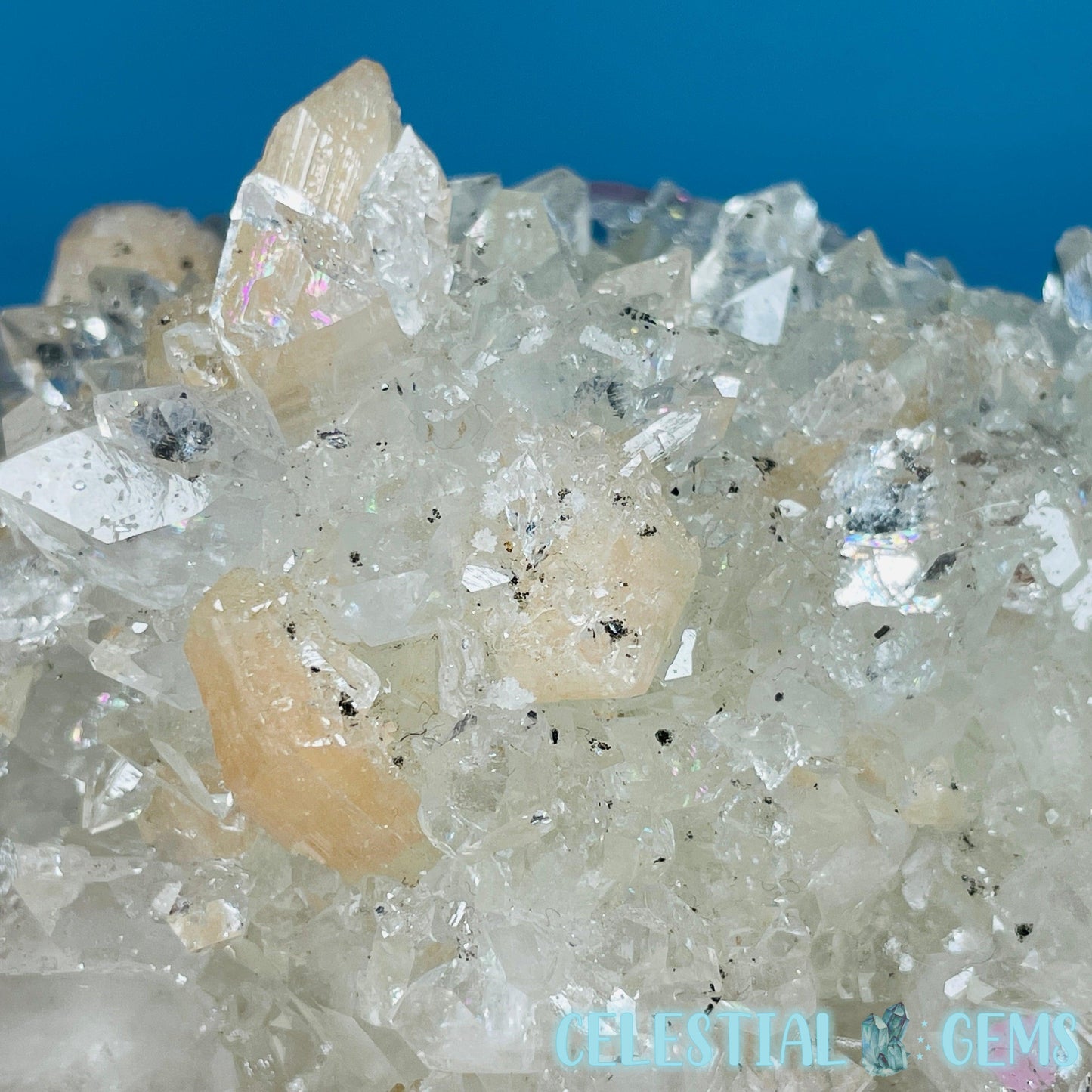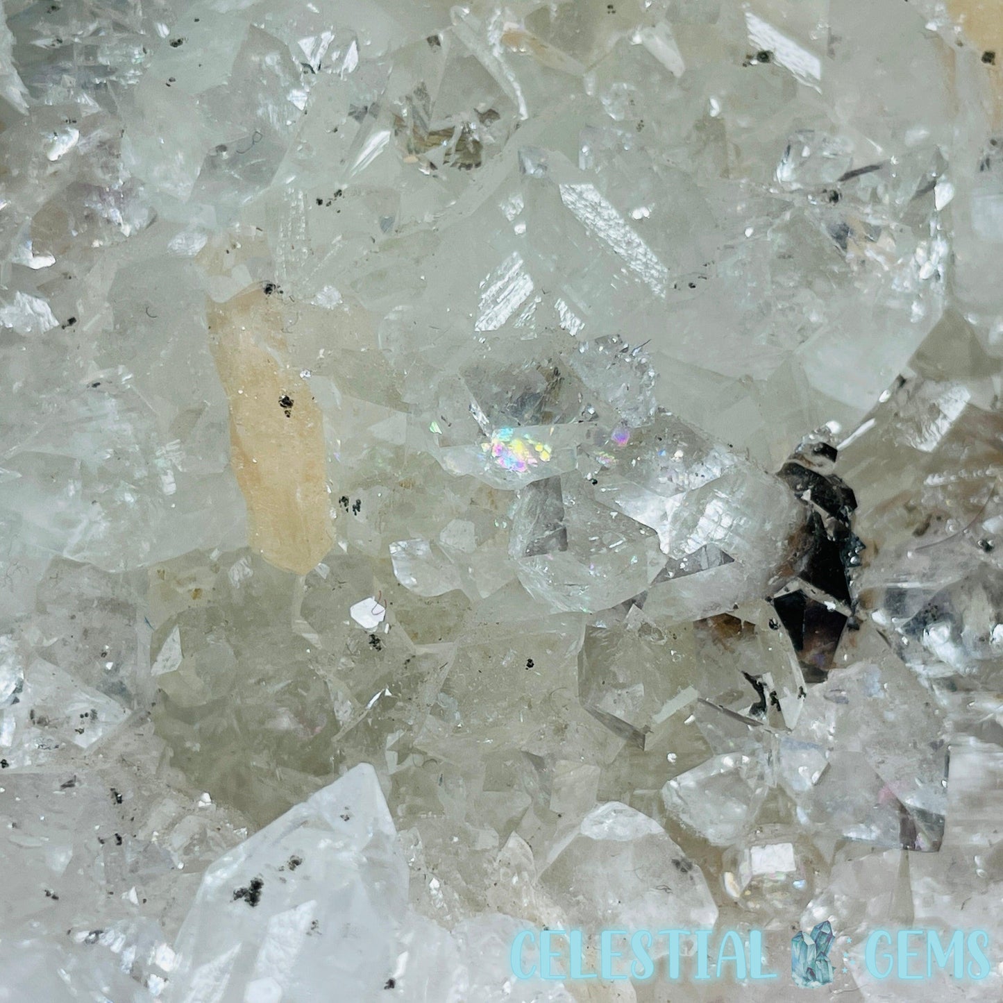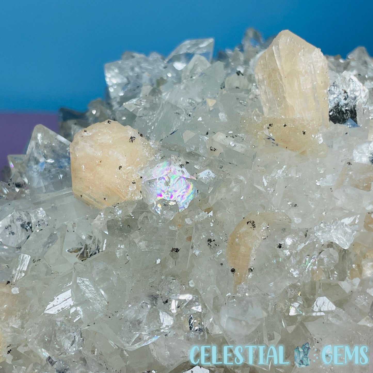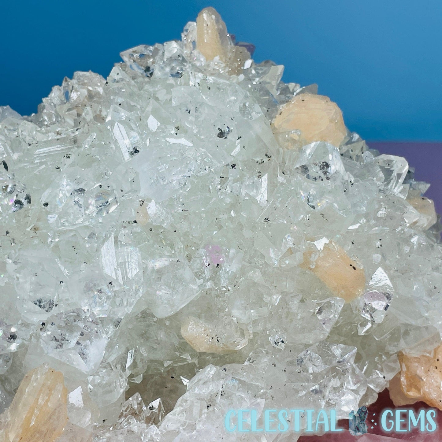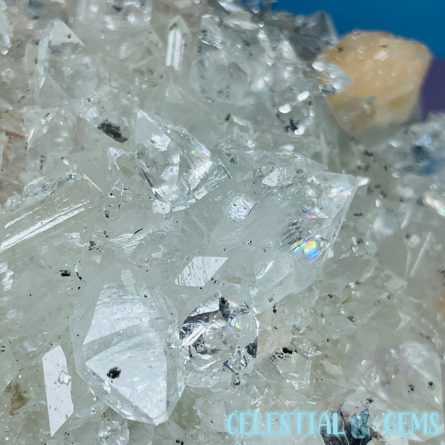This is from a very high quality batch of Grade A Diamond Apophyllite we sourced from India, with incredible gemmy clear crystals with intense mirror shine, rainbow flashes and some double terminated point formations. This quality is rare and highly sought after.