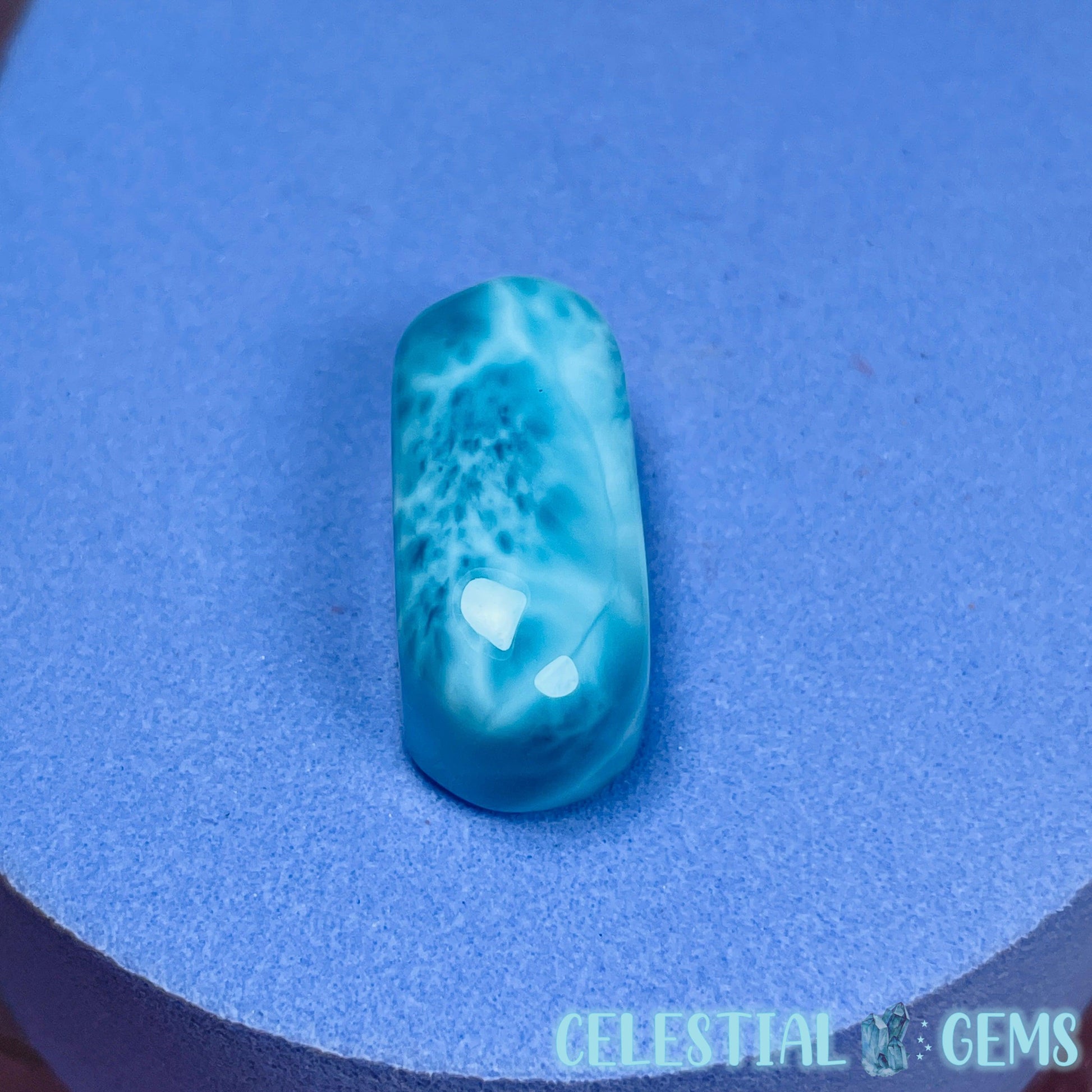 This is a rare A Grade Larimar cabochon in an oval pillow shape (Atlantic Stone, Blue Pegmatite) from the Dominican Republic. This mineral is extremely rare and is only mined in one place in the world.