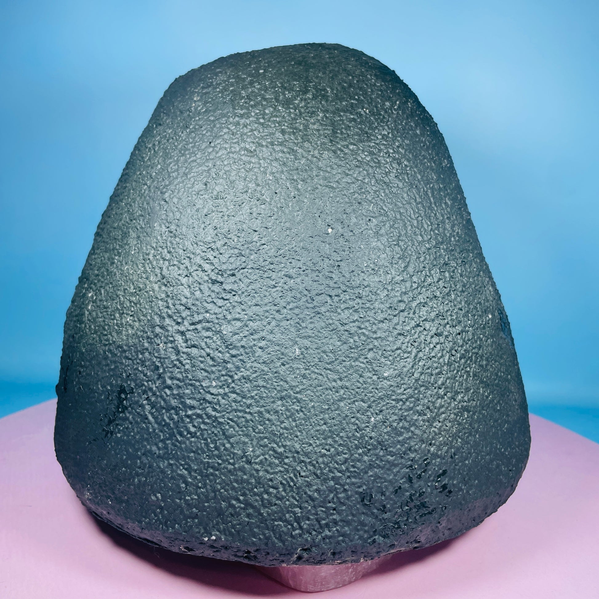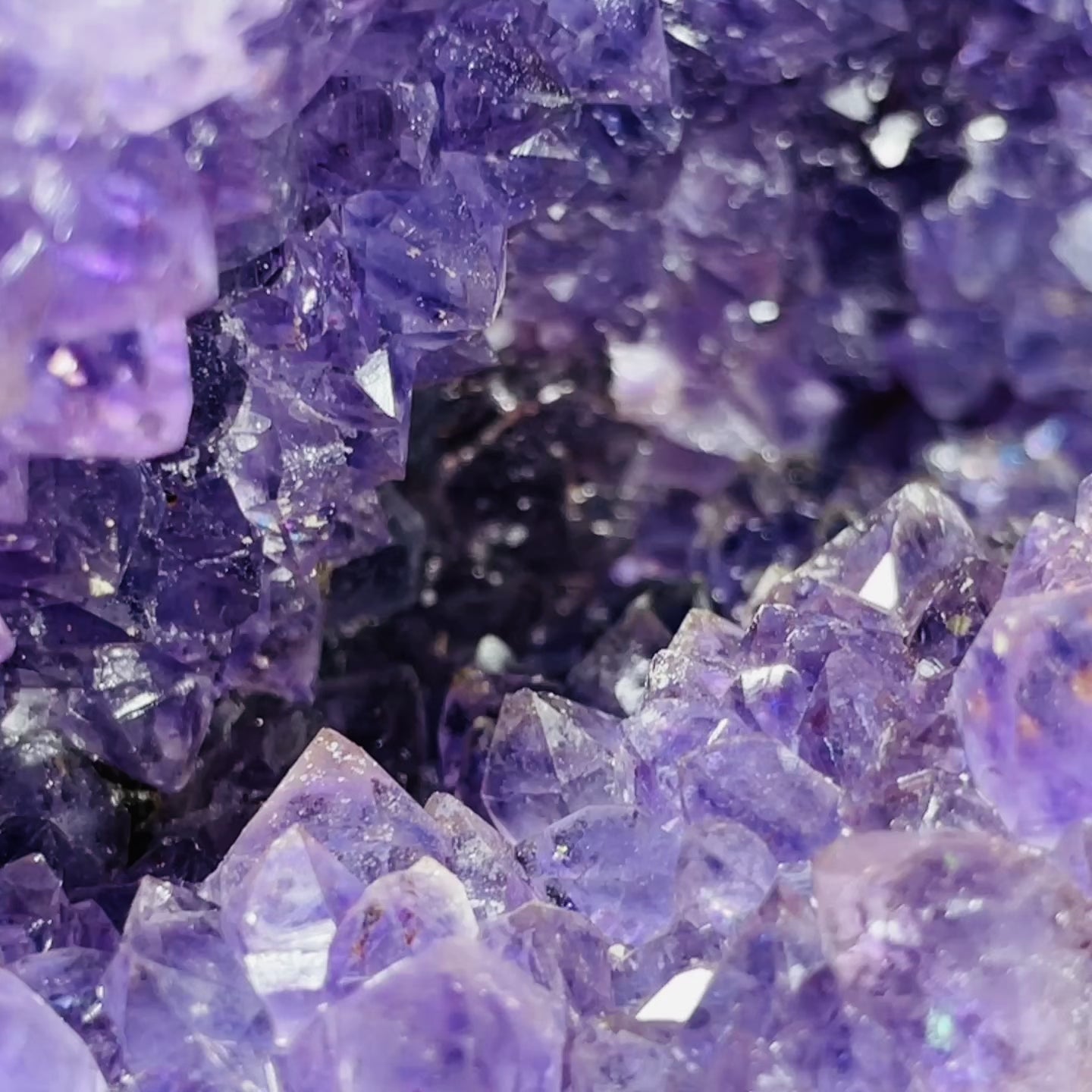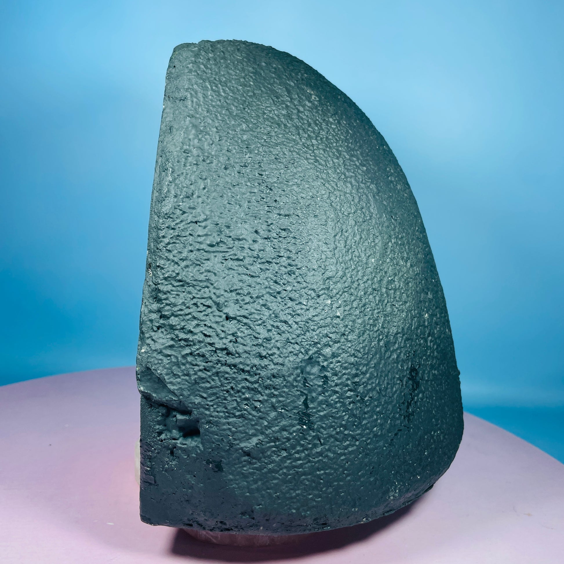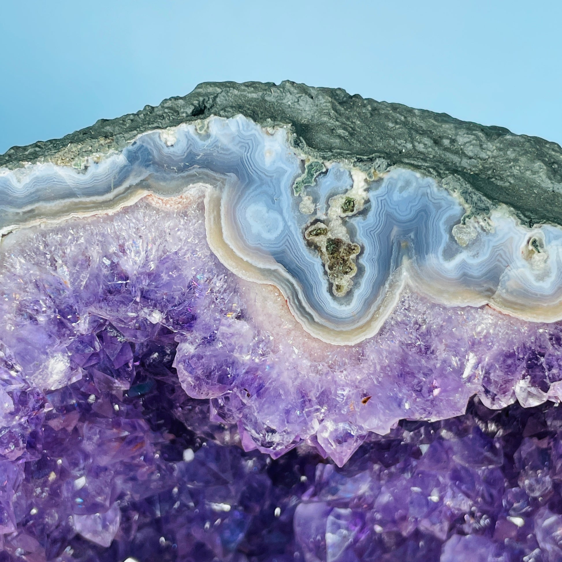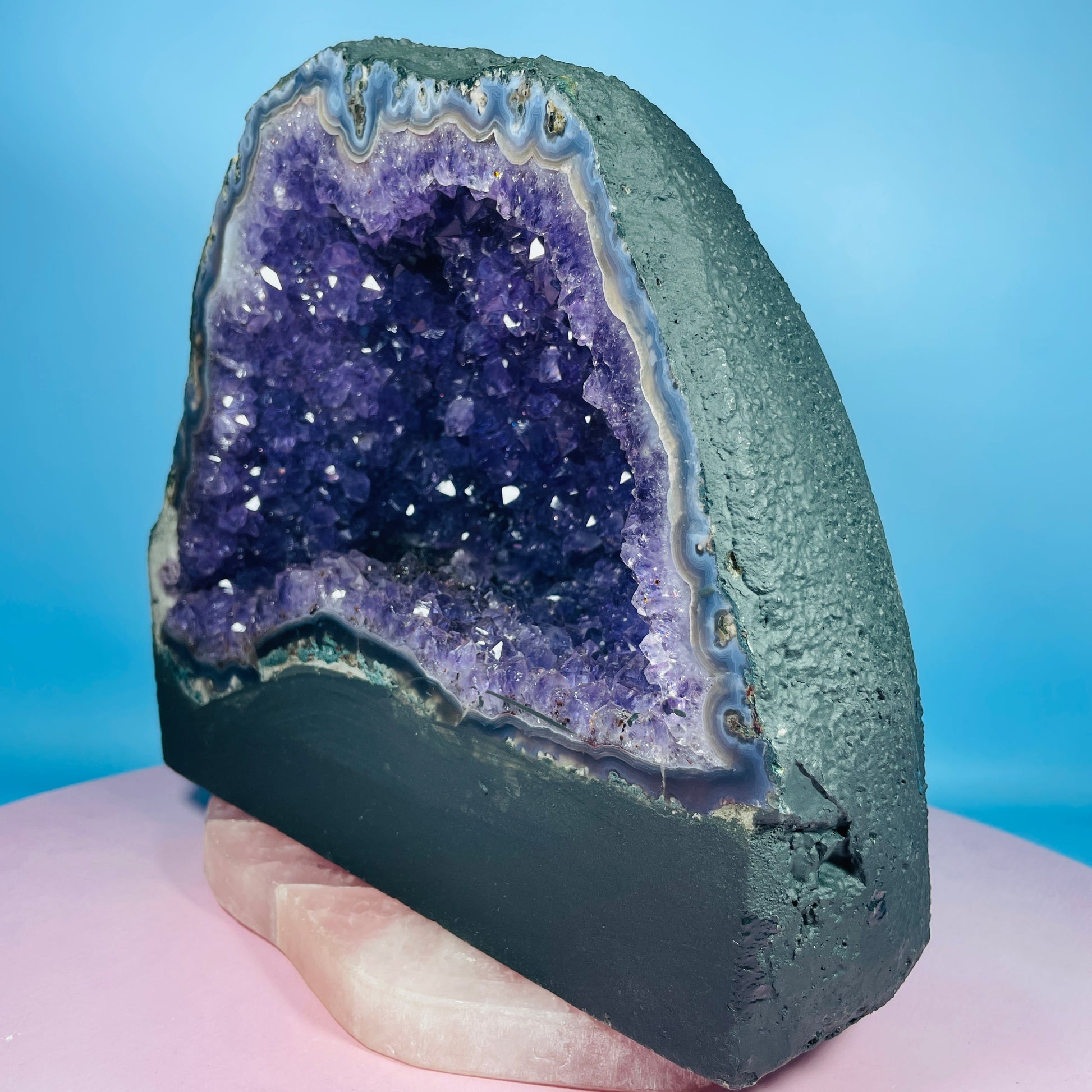 A gorgeous cluster geode of sparkly Amethyst with mossy green and blue Agate around the border. Standing as a 'cave' with a concrete base. Medium-sized. Sourced from Brazil.