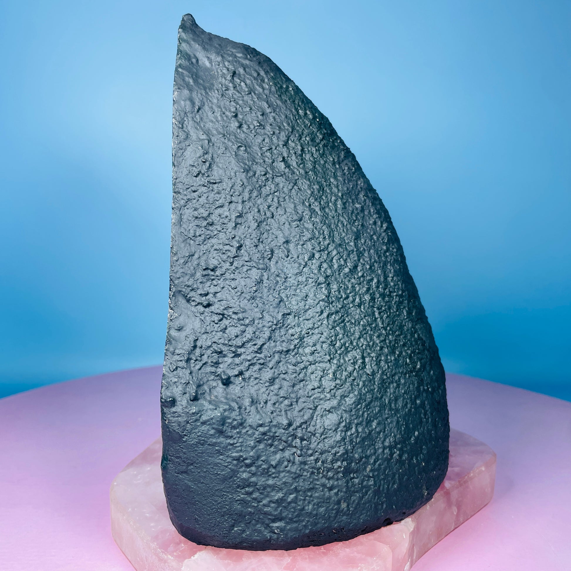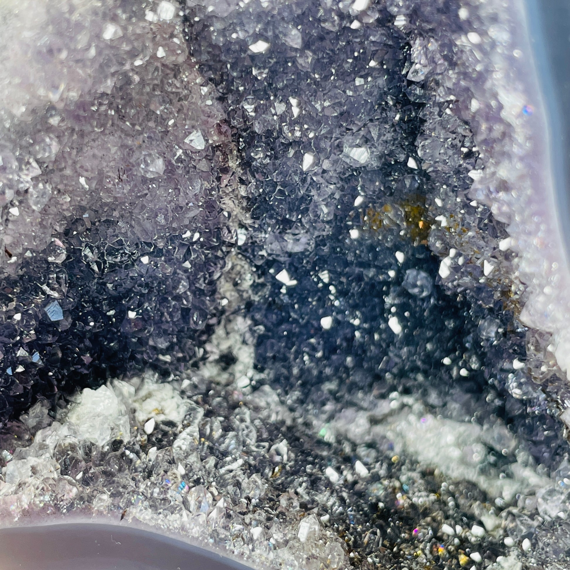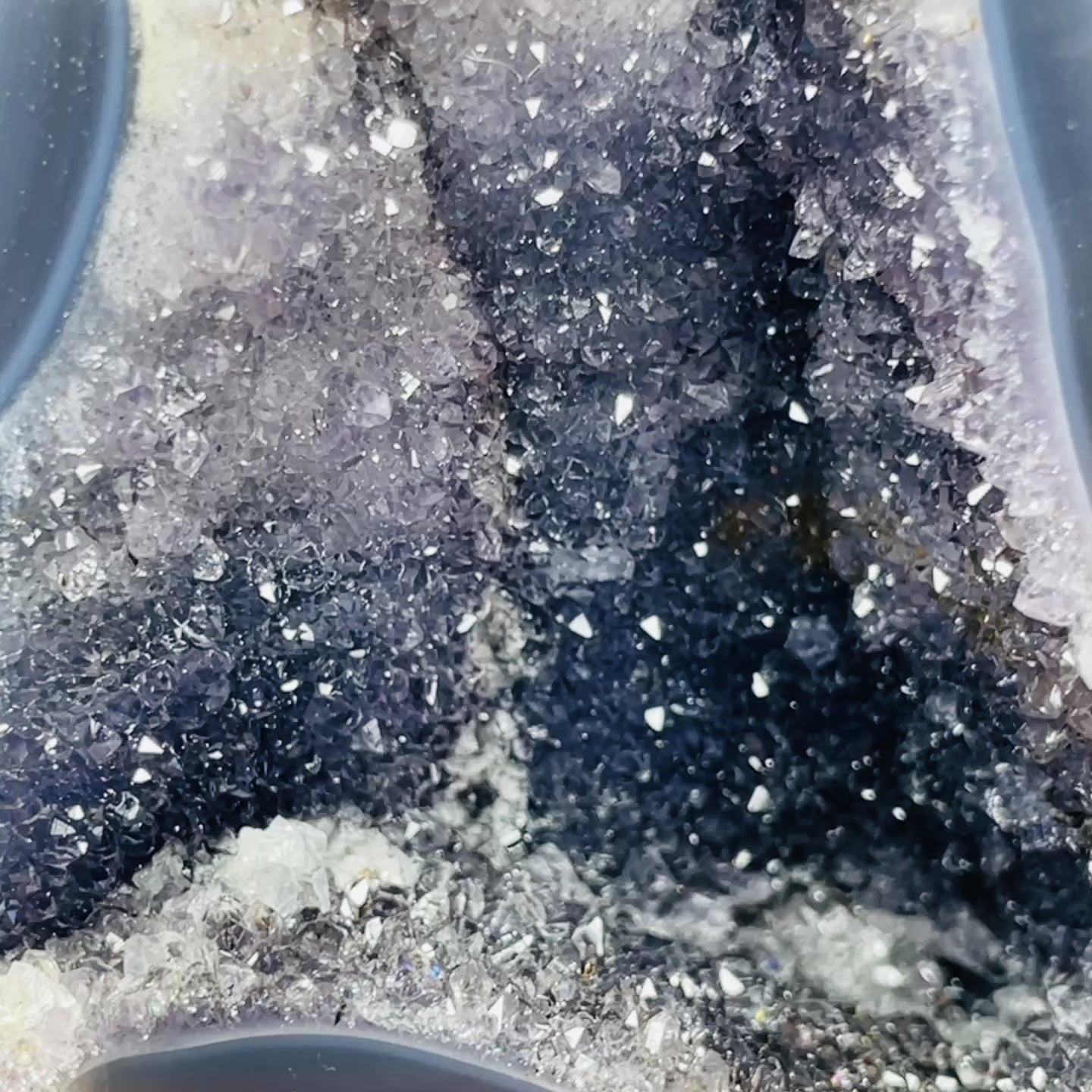 A gorgeous cluster geode of sparkly Amethyst with a thick bank of blue Agate around the edge. Standing as a 'cave' with a concrete base and rear. Small-sized. Sourced from Brazil.