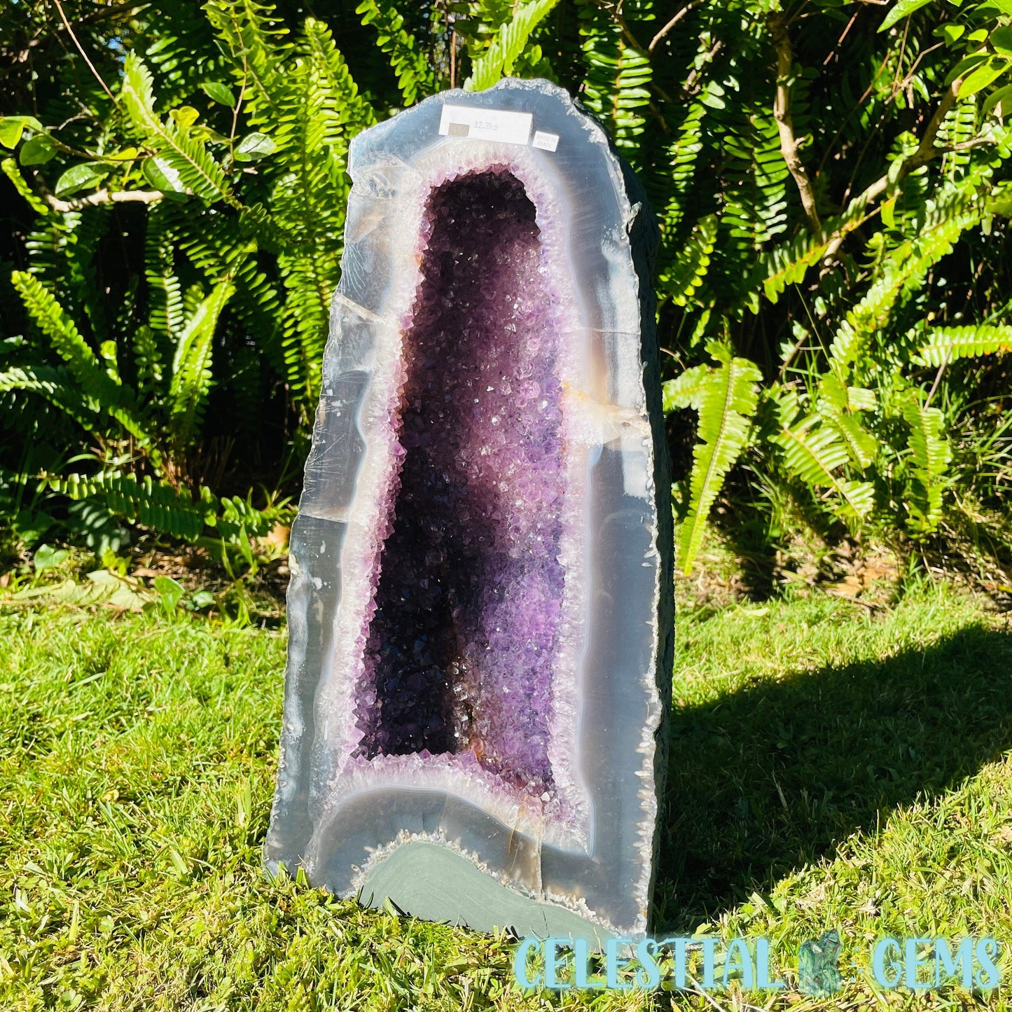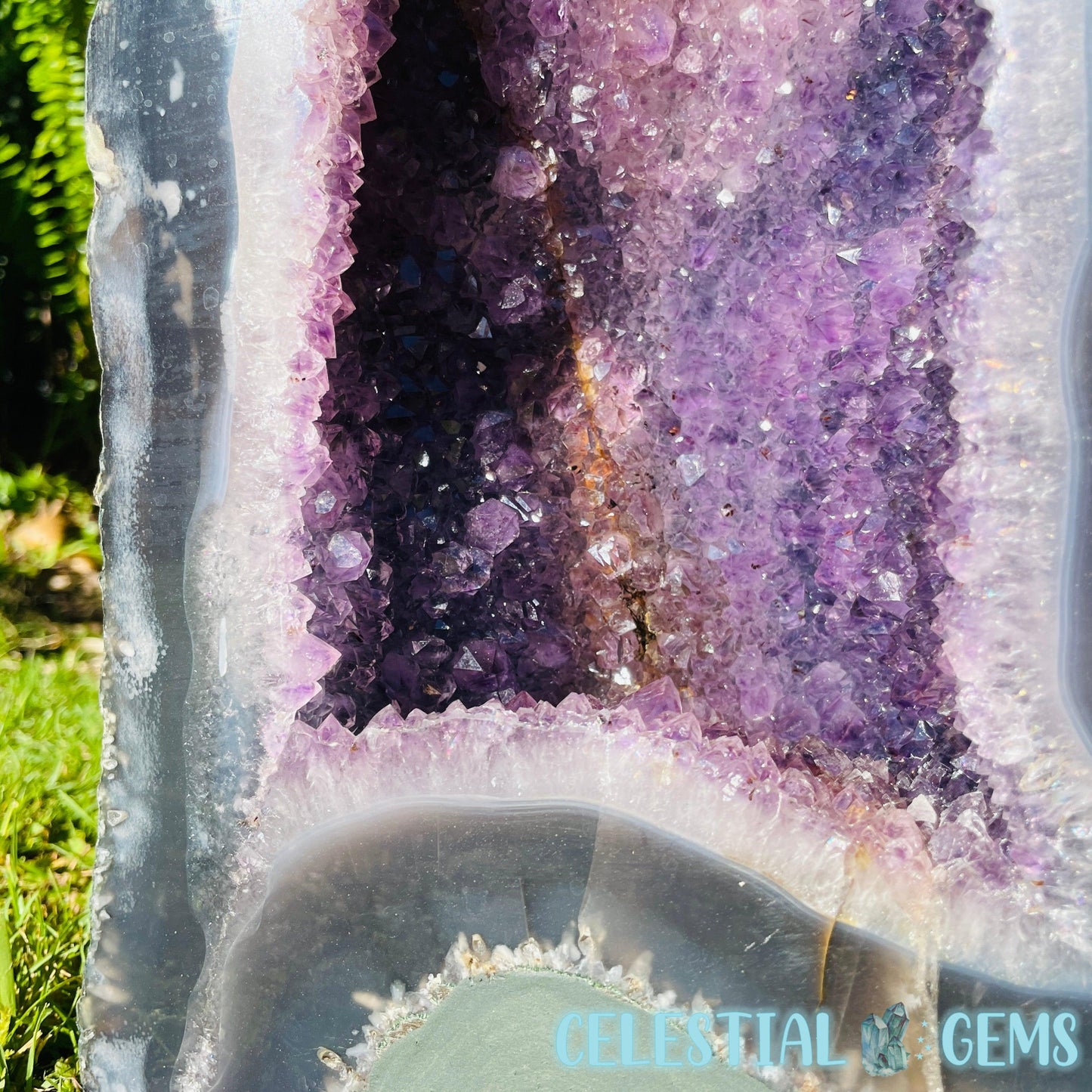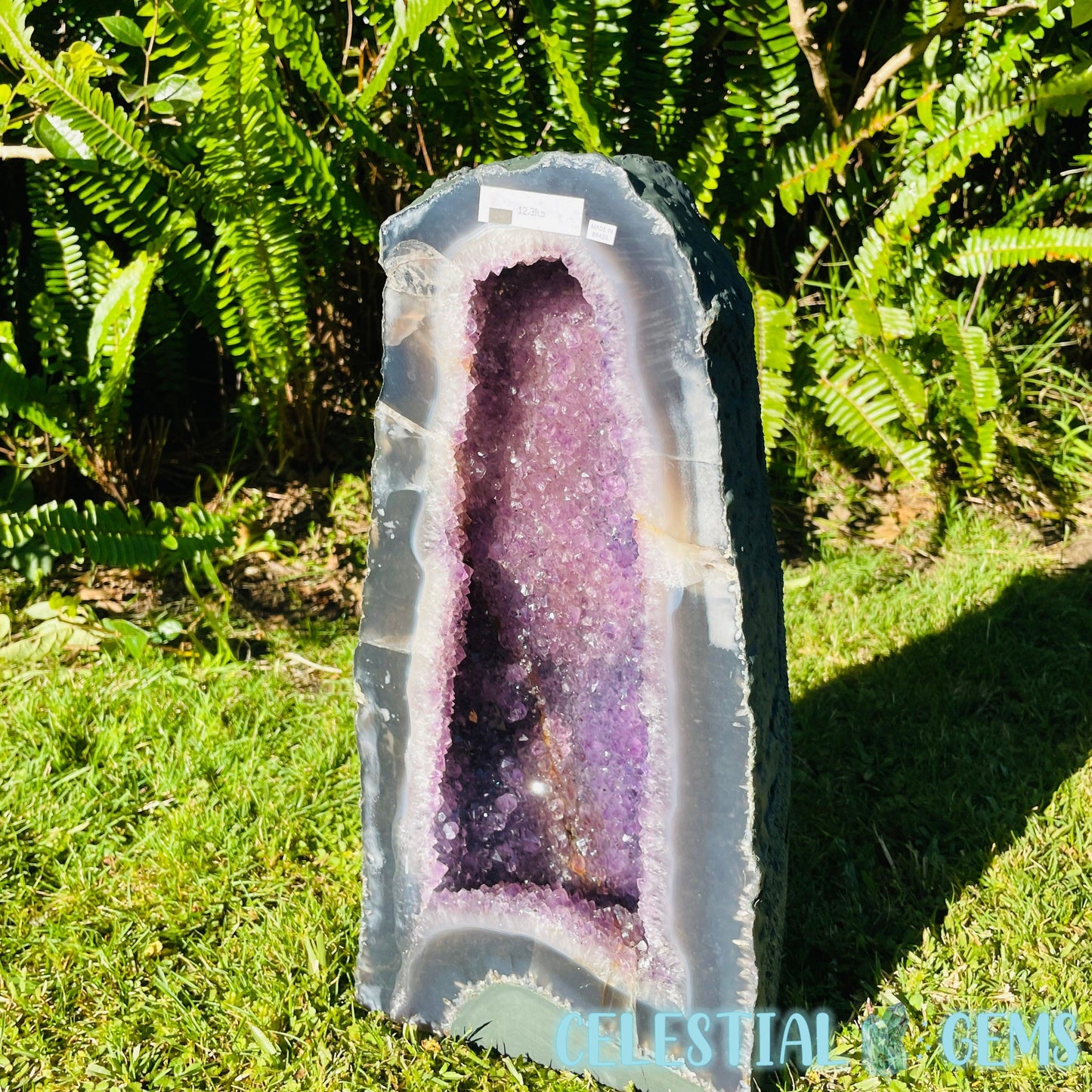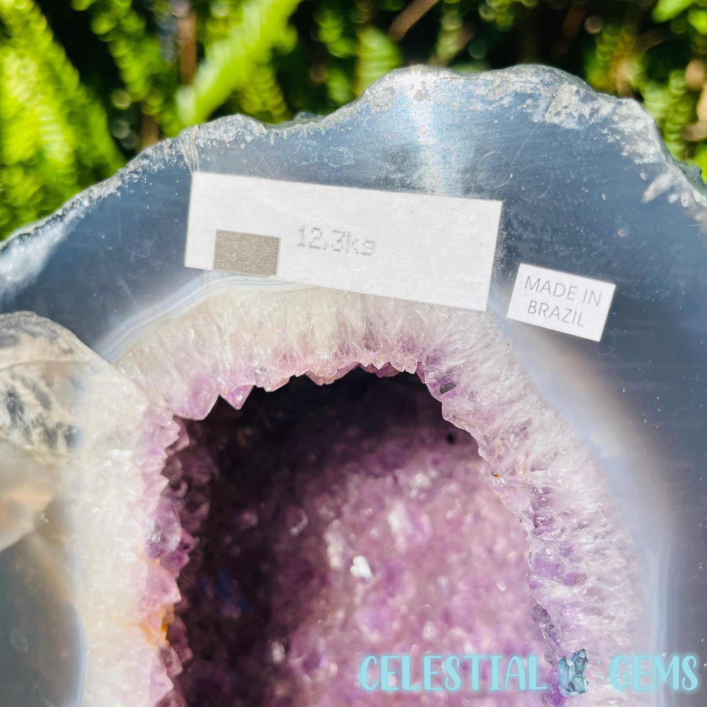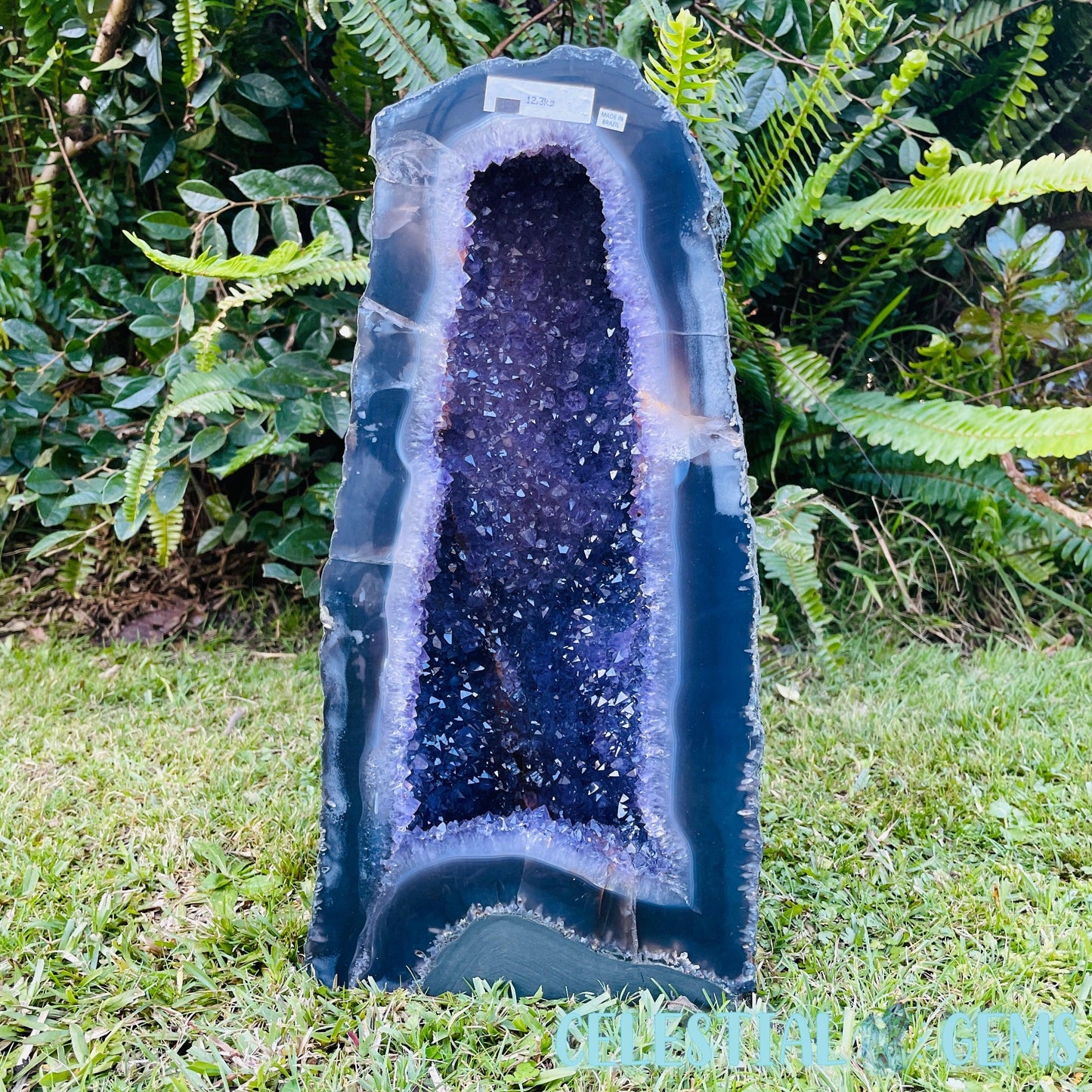 This sparkly Amethyst and Agate geode cave has an incredible dark purple colour on its druzy with thick blue and white banded Agate border. Approx. 37cm x 19cm x 14cm. Weight 12.3kg.