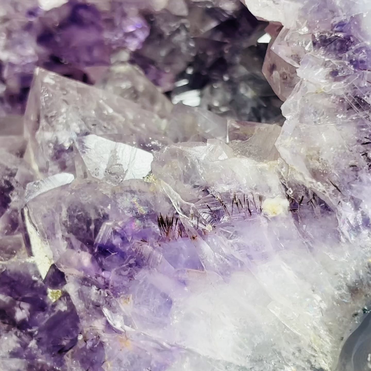 A gorgeous cluster geode of sparkly Amethyst that's been fully polished on the rear with swirling patterns of blue and green Mossy Agate. Standing as a 'cave' with a concrete base. Medium-sized. Sourced from Brazil.