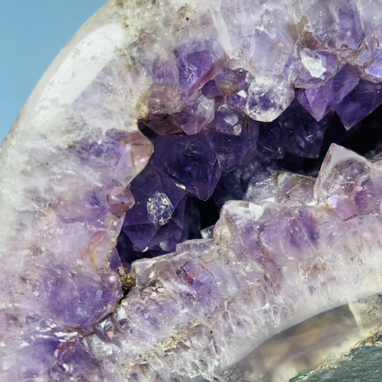 A gorgeous, fully rear-polished cluster geode of sparkly Amethyst with all polished Moss Agate on the rear. Standing as a 'cave'. With a concrete base. Small-sized. Sourced from Brazil.