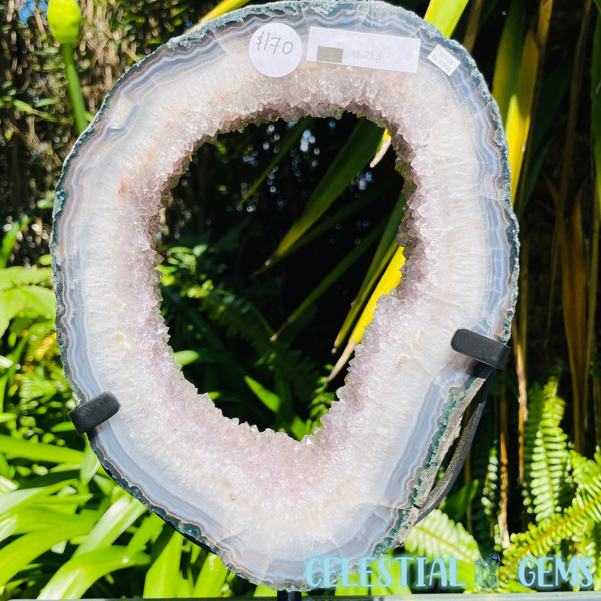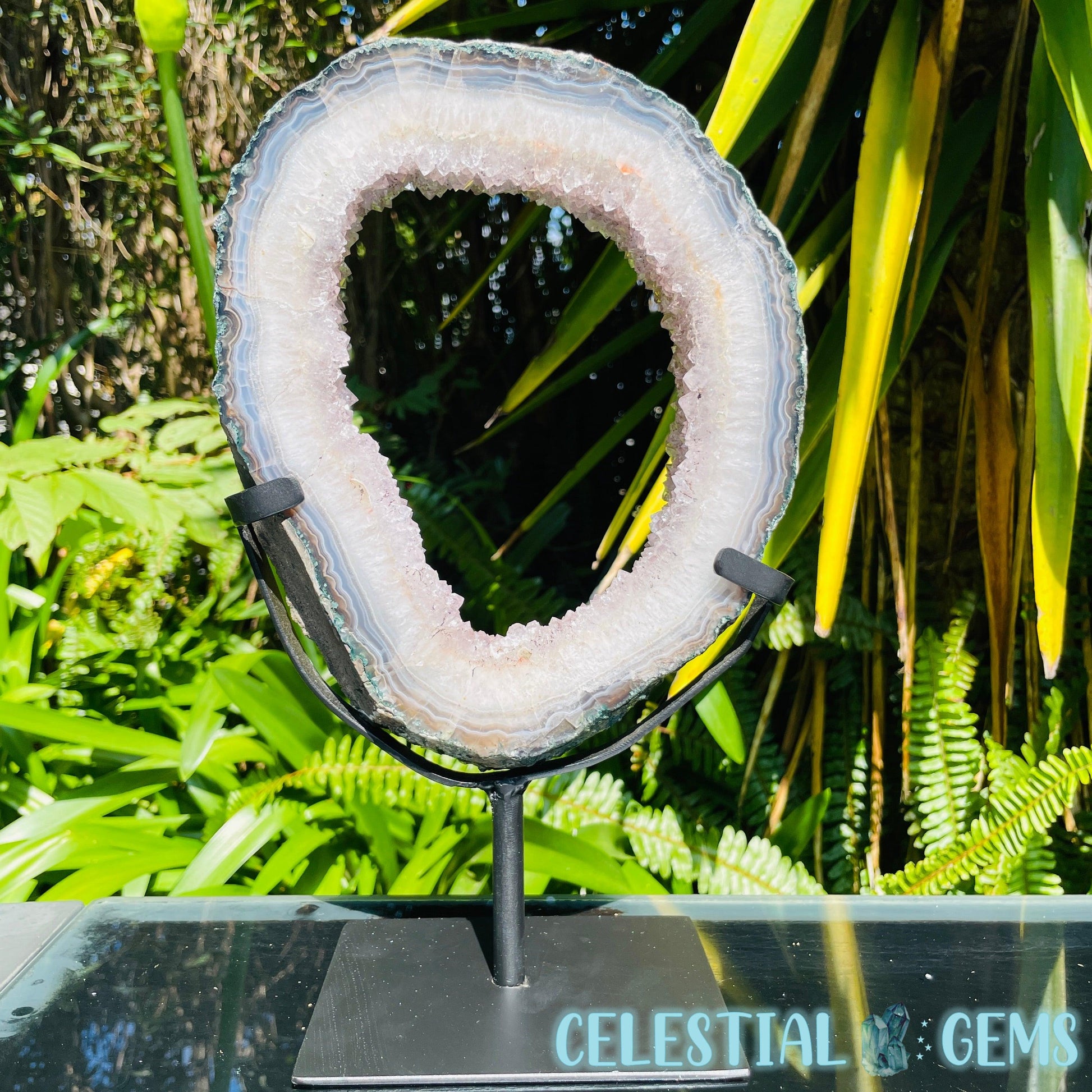 A slice of an Amethyst cluster geode with a natural edge and a striped layer of Agate. Also known as a 'Portal Ring'. With a sparkly central ring of Amethyst cluster within.