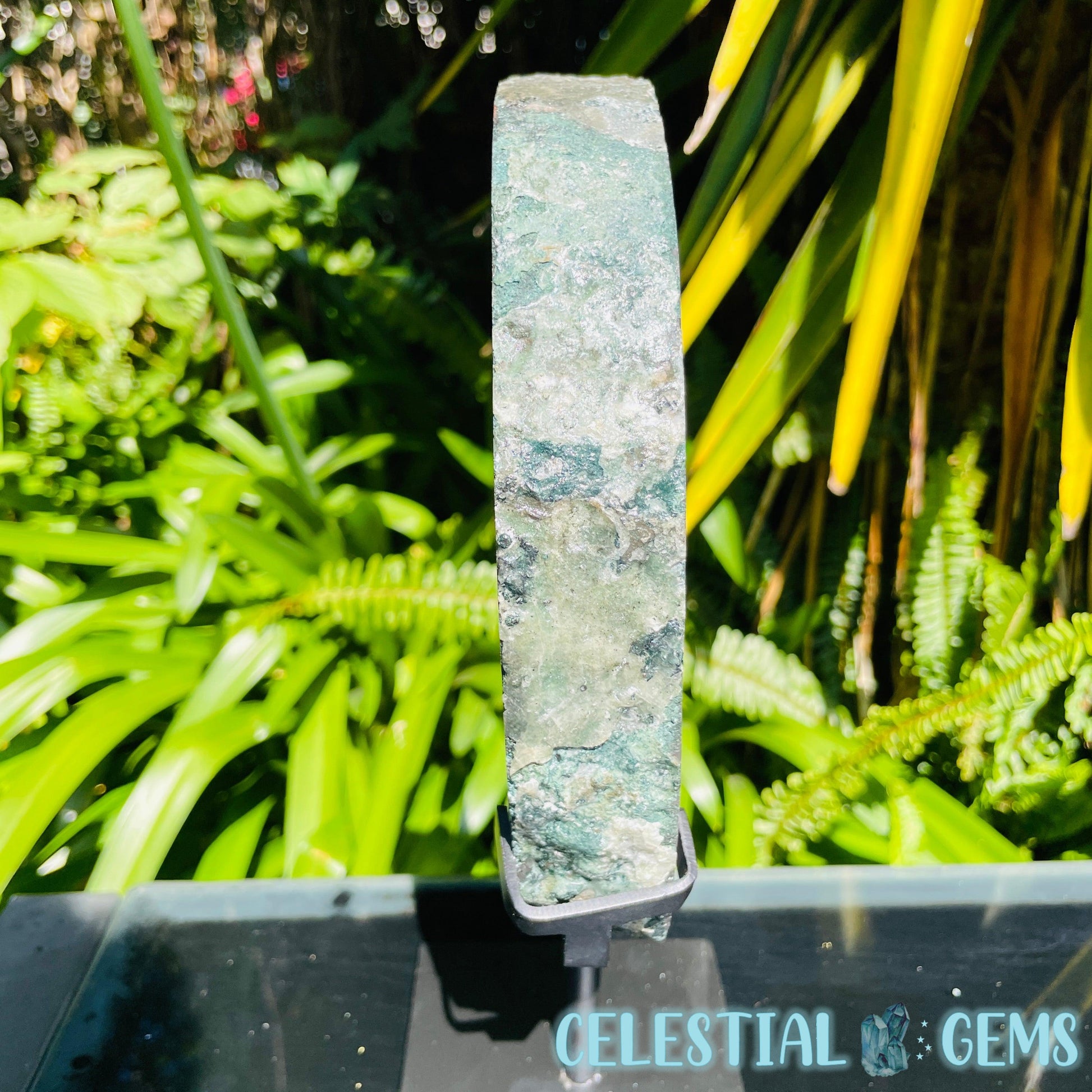 This large slice measures 21.4cm x 17cm x 3.2cm. Weight 1.7kg. The stand base measures 12cm x 10cm on the bottom and adds an extra 6.5cm height to the slice.